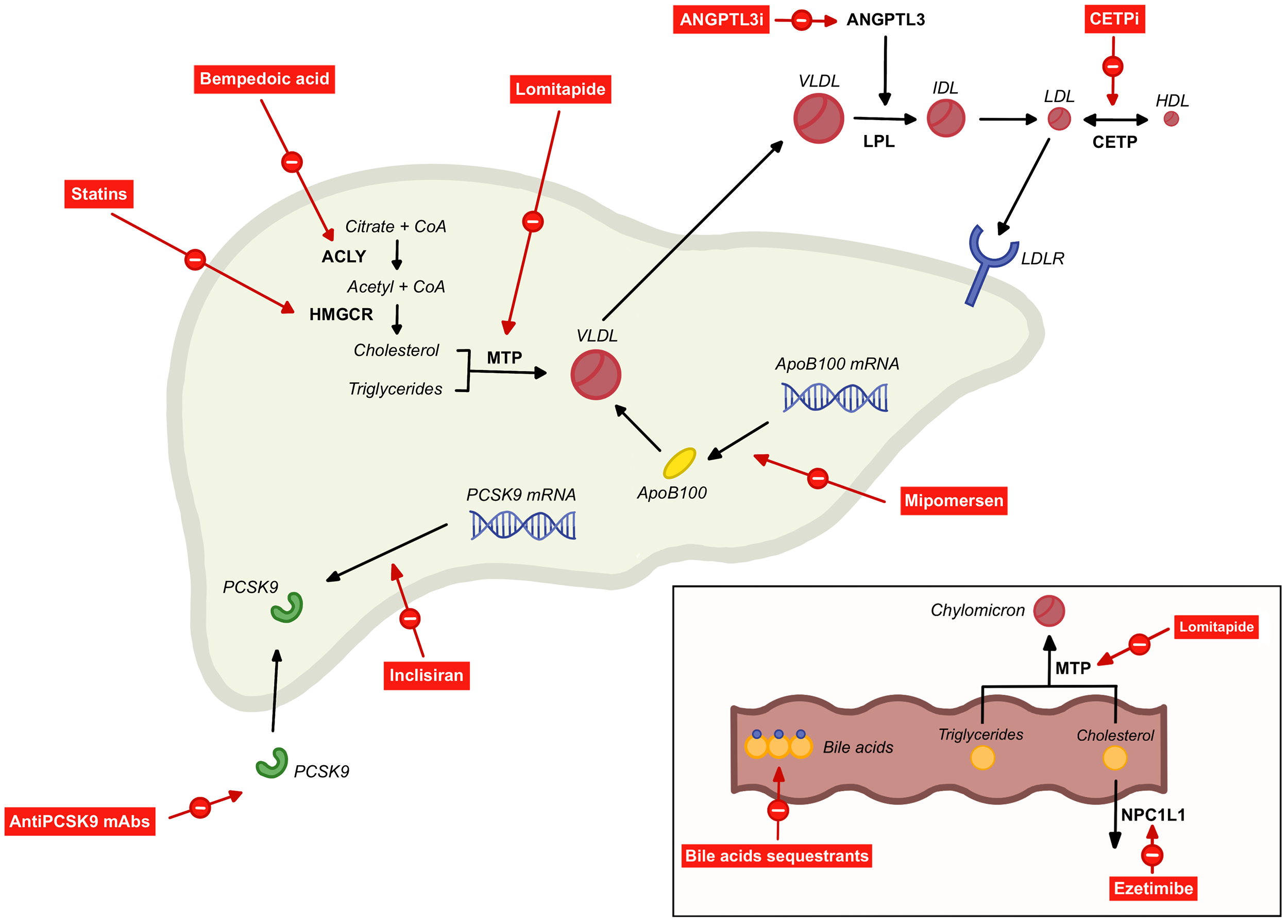 HMG-CoA, 3-hydroxy-3-methylglutaryl-coenzyme A; ApoB, apolipoprotein B; PCSK9, proprotein convertase subtilisin/kexin type 9; siRNA, small interfering RNA; NPC1L1, Niemann-Pick C1-Like 1; mAb, monoclonal antibody; CETP, cholesteryl ester transfer protein; MTP, microsomal triglyceride transfer protein; ACLY, adenosine triphosphate-citrate lyase; LDL-C, low-density lipoprotein-cholesterol; CVOT, cardiovascular outcome trial; FH, familial hypercholesterolaemia.