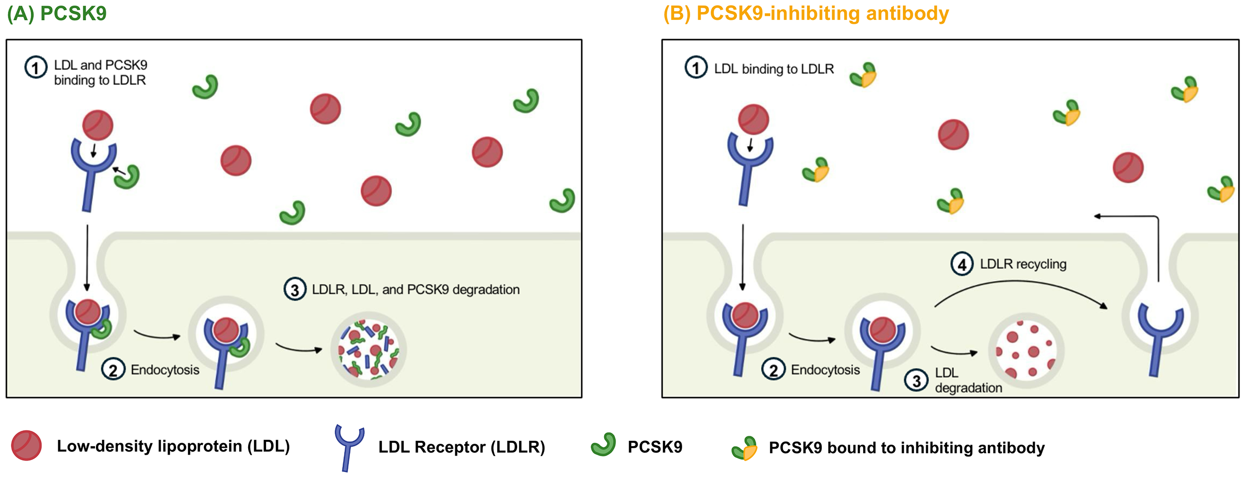 Proprotein convertase subtilisin/kexin type 9 (PCSK9) action and therapeutic inhibition. (A) PCSK9 inactivates the low-density lipoprotein receptor (LDLR) by binding to the receptor (1), targeting it for lysosomal degradation. The LDLR is then endocytosed (2) and degraded (3), preventing its normal recycling to the cell surface membrane. (B) PCKS9-inhibiting (monoclonal) antibody therapies bind PCSK9 in the circulation, preventing its binding to the LDLR. Circulating LDL is free to bind the LDLR (1), which is then endocytosed (2). LDL is subsequently degraded intracellularly (3) and, in the absence of PCSK9, the LDLR is recycled to the cell surface membrane (4). Figure was created using Procreate (version 5.4.4; Savage Interactive Pty Ltd., Hobart, Tasmania, Australia). The authors have no financial or personal relationship with Procreate, and the use of this tool does not imply any endorsement.