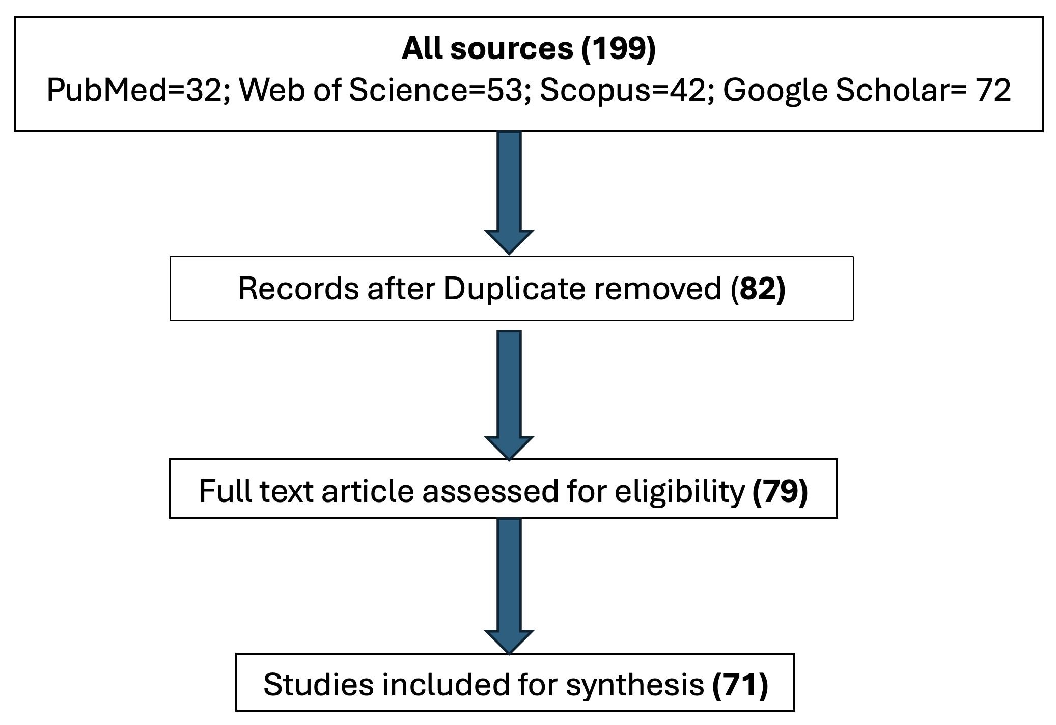Exclusion criteria included studies on other healthcare professionals, reviews without primary data, studies outside Saudi Arabia, or where burnout was not a primary or secondary outcome. PubMed, Scopus, Web of Science, and Google Scholar were searched using keywords, Boolean operators, and Medical Subject Headings (MeSH) terms (e.g., “burnout”, “physicians”, “doctors”, “Saudi Arabia”, “emotional exhaustion”, “depersonalization”, “personal accomplishment”). Following Preferred Reporting Items for Systematic Reviews and Meta-Analyses extension for Scoping Reviews (PRISMA-ScR) guidelines, 199 records were identified, 82 unique records remained after removing duplicates, and 71 eligible studies were included after screening by two independent reviewers (Fig. 1). Data were extracted using a standardized form (Table 1) and analyzed using a mixed-methods approach. Although no formal quality assessment was conducted, methodological rigor, sample representativeness, and tool reliability were informally evaluated. Findings are reported per PRISMA-ScR, including descriptive tables, narrative summaries, and visual representations of prevalence and themes.