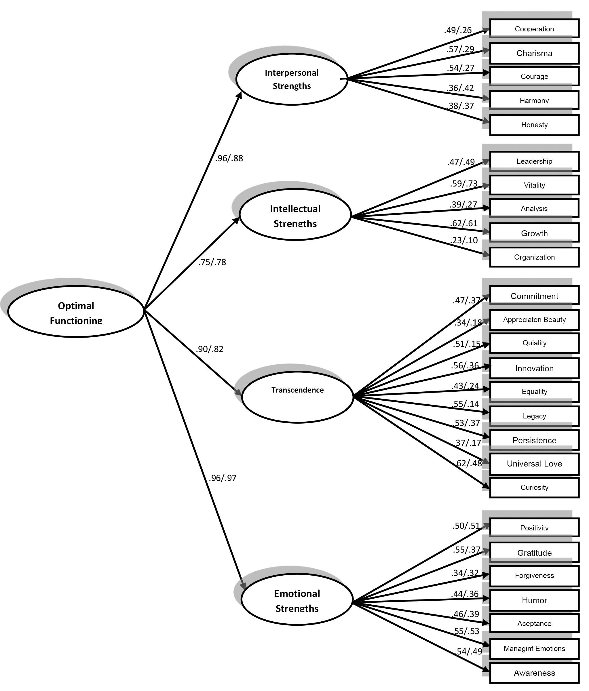 The main difference of the present study in comparison to previous ones is the proposal of a general factor called Optimal Functioning. This factor indicates whether an individual uses his strengths in a way that is adaptive to their environment, with higher scores suggesting higher awareness of strengths and higher satisfaction being derived from their usage. The only author to propose a general factor called “goodness” is Macdonald et al. (2008), yet it is not a hierarchical factor. Unlike previous proposals, the factor of Optimal Functioning provides for a representation of the overall level of satisfaction of the individual, not just the strengths that are balanced.