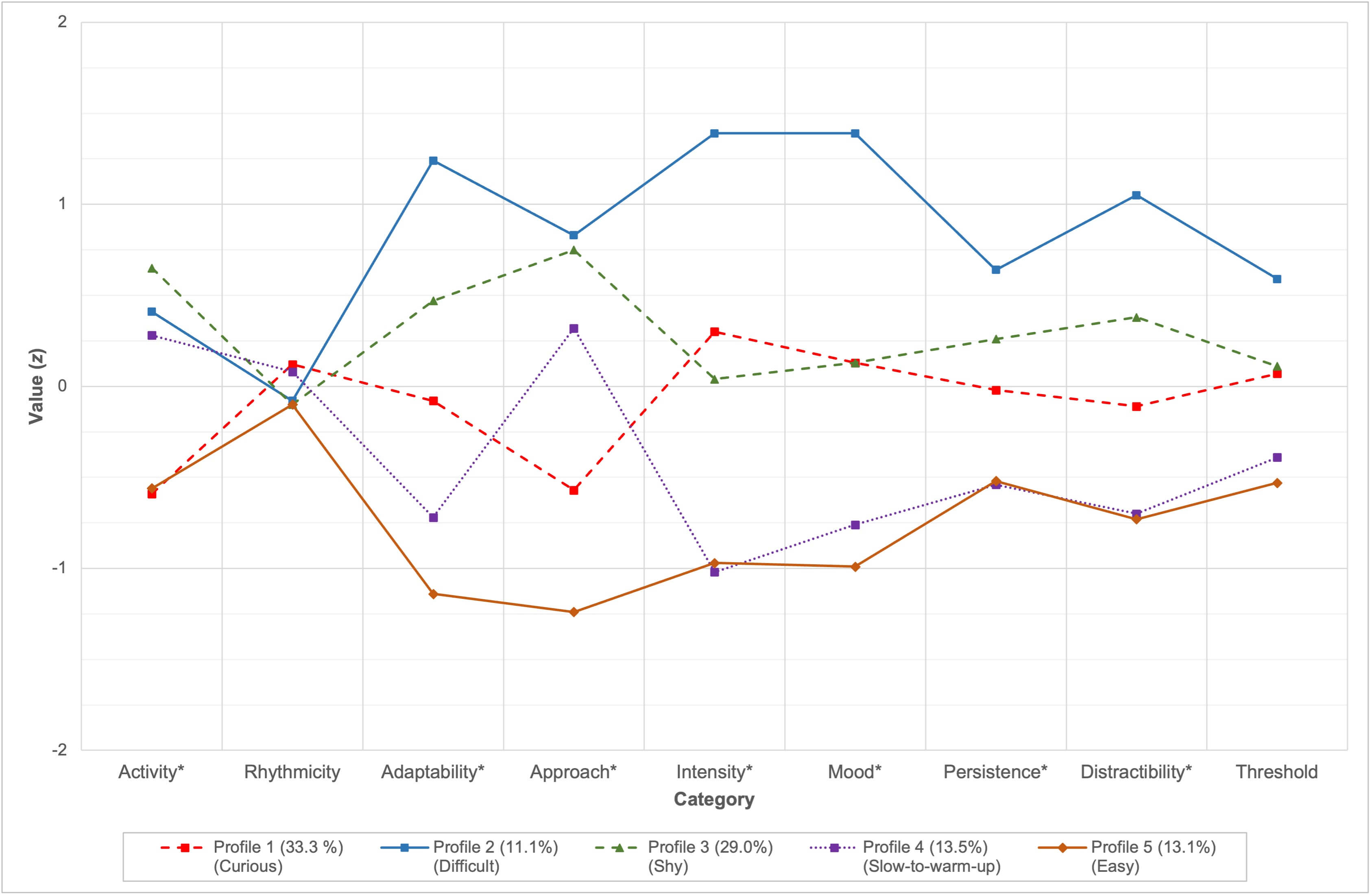 A five-profile solution emerged as optimal. Three profiles resembled the classic NYLS types—Easy (13.1%), Difficult (11.1%), and Slow-to-warm-up (13.5%)—and two additional profiles were identified: Curious (33.3%) and Shy (29.0%). The new profiles reflected coherent behavioral patterns centered on approach-withdrawal tendencies and activity level, demonstrated conceptual convergence with other temperament and personality typologies, and remained consistent across demographic groups.