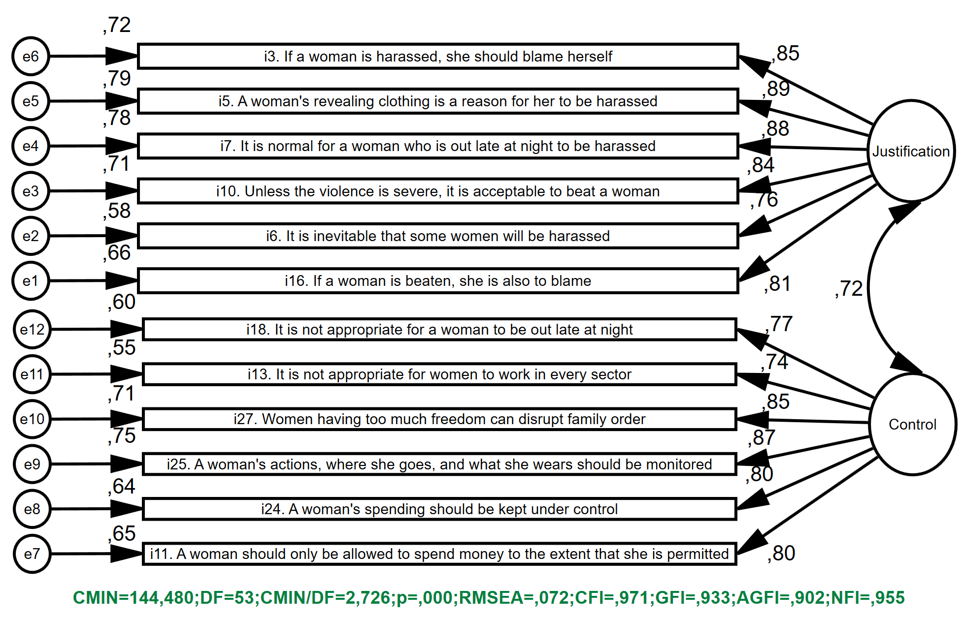 As a result of exploratory and confirmatory factor analyses, a two-factor, 12-item structure was obtained. The scale explains 76.3% of the variance, with Cronbach’s α of 0.94, Gutman’s 0.95, and McDonald’s Omega ω of 0.96. The fit indices for the construct [χ2/df = 2.726, Root Mean Square Error of Approximation (RMSEA) = 0.072, comparative fit indices (CFI) = 0.97, goodness-of-fit index (GFI) = 0.93, adjusted goodness of fit index (AGFI) = 0.90, and normed fit index (NFI) = 0.96] were found to be at an adequate level. The legitimization factor reflects individuals’ tendency to view actions such as violence, harassment, or mistreatment toward women as legitimate, understandable, or justified for various reasons. This factor consists of 1–6 items, explaining 63.2% of the variance, with Cronbach’s α of 0.94, Gutman’s 0.94, and McDonald’s Omega ω of 0.92. The control factor represents a perspective that considers it legitimate to restrict women’s freedom, establish control over them, and constantly monitor their actions. This factor consists of items 7–12 and explains 13.1% of the variance, with Cronbach’s α of 0.92, Gutman’s 0.91, and McDonald’s Omega ω of 0.94.