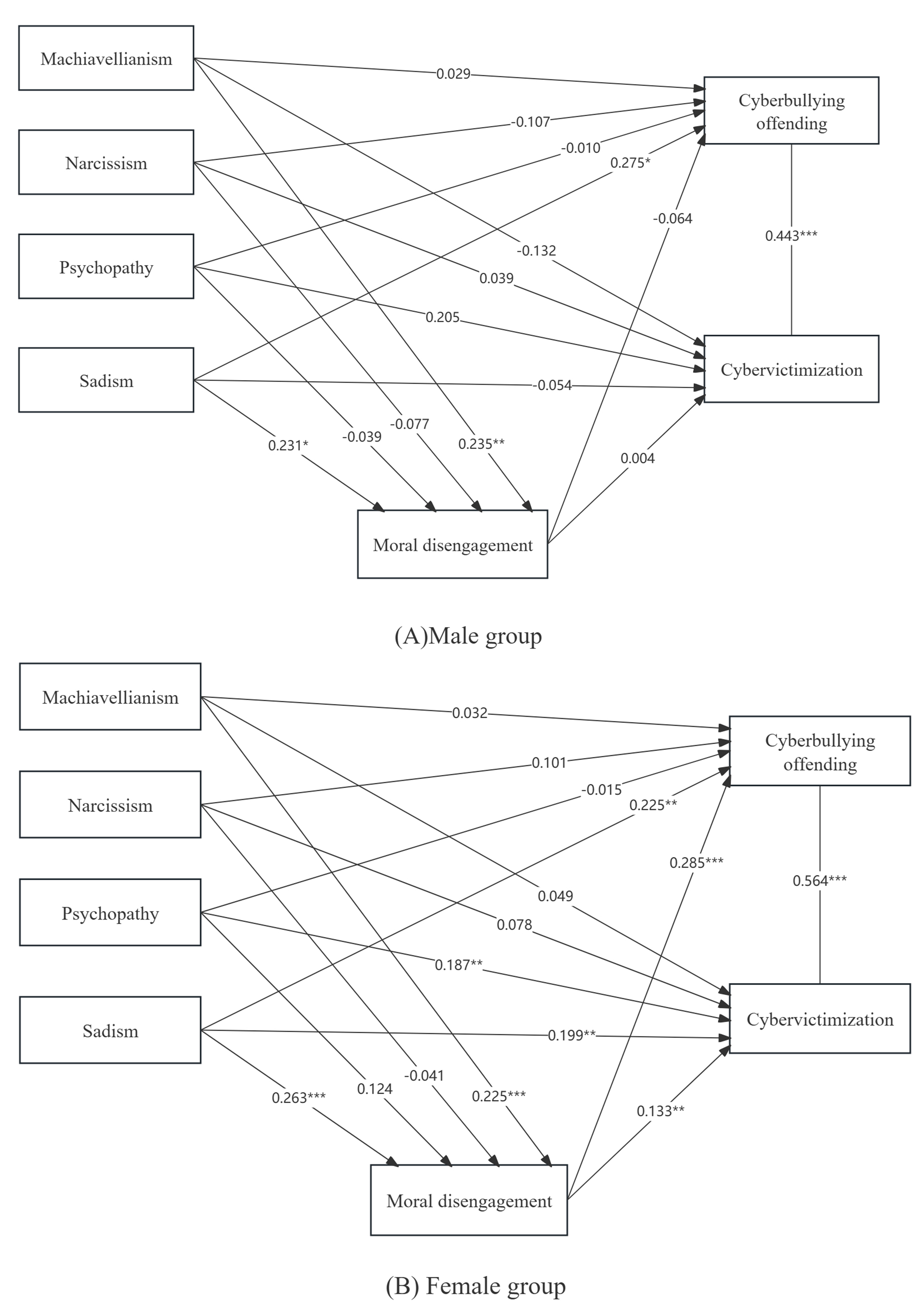 As detailed in Fig. 1A and Table 2, in the male group, Machiavellianism (beta = 0.235, p = 0.003) and sadism (beta = 0.231, p = 0.036) predicted moral disengagement significantly; sadism (beta = 0.275, p = 0.017) predicted perpetration of cyberbullying significantly. Moral disengagement had no significant predictive effect on cyberbullying offending and cybervictimization, and had no mediating effect on the links.