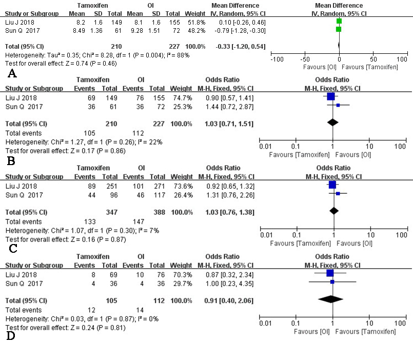 Fig. 3.TMX versus OI: pooled result of all included studies. (A) Endometrium thickness. (B) Clinical pregnancy rate. (C) Implantation rate; (D) Miscarriage rate.