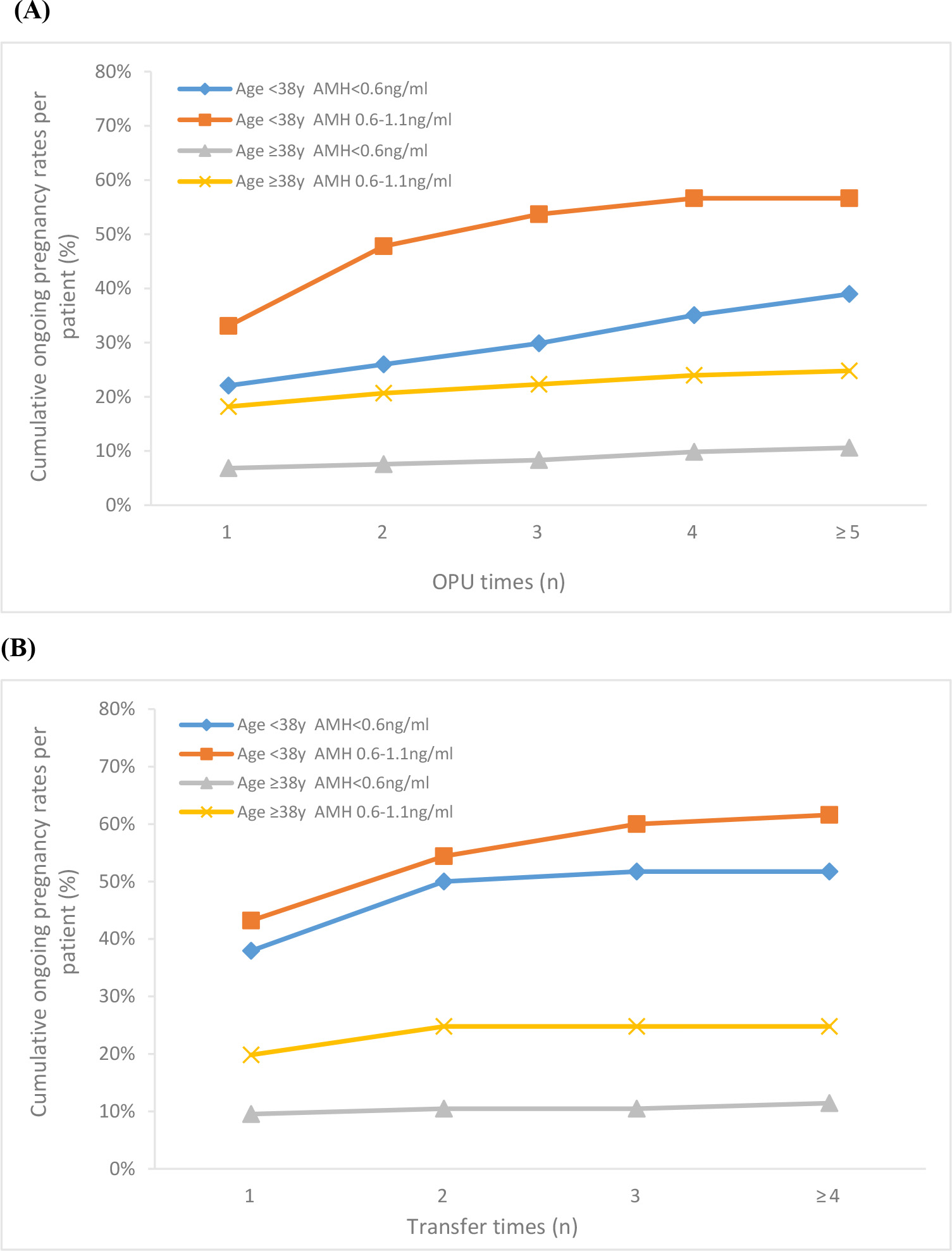 consecutive OPU (A) and ET cycles (B) for women with AMH