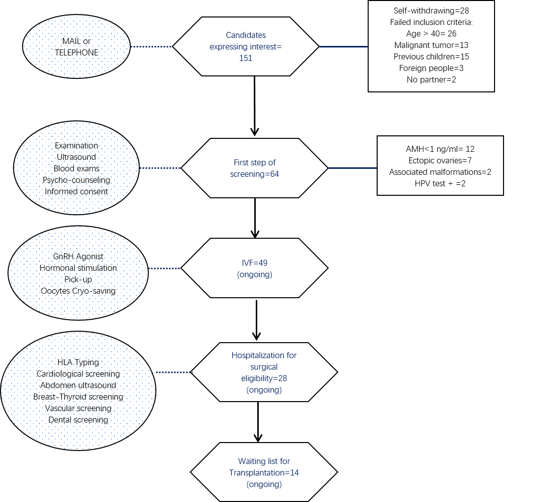 The inclusion on the waiting list is the last of several steps to obtain gynecological and surgical eligibility. The second step is ovarian stimulation in order to retrieve and cryopreserve oocytes before transplantation to ensure ovarian function prior to invasive prolonged surgery and because immunosuppressive therapy after surgery potentially decreases the gonadal response [9]. Internationally recognized target is a minimum number of 10 good quality blastocysts but since embryo cryopreservation is banned in Italy, a retrieval of at least 10 oocytes has been identified as a requirement for inclusion in the waiting list, in one or more stimulations.