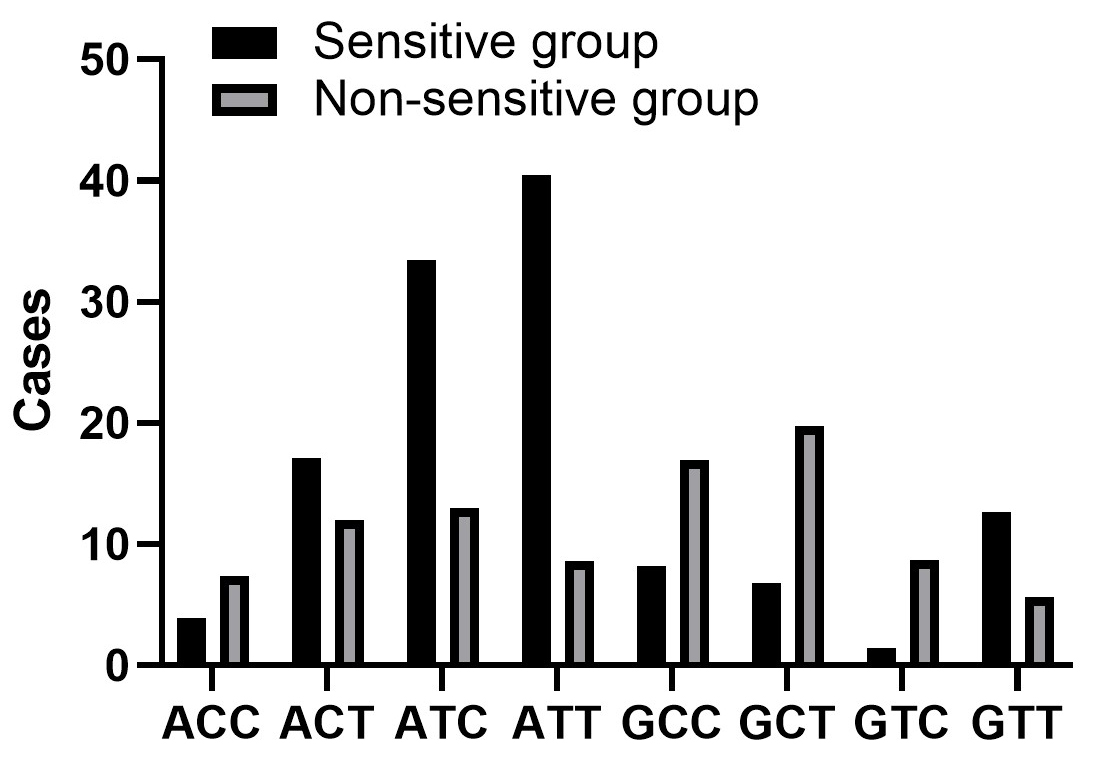 | Site | Genotype | Sensitive group | Non-sensitive group | p | |