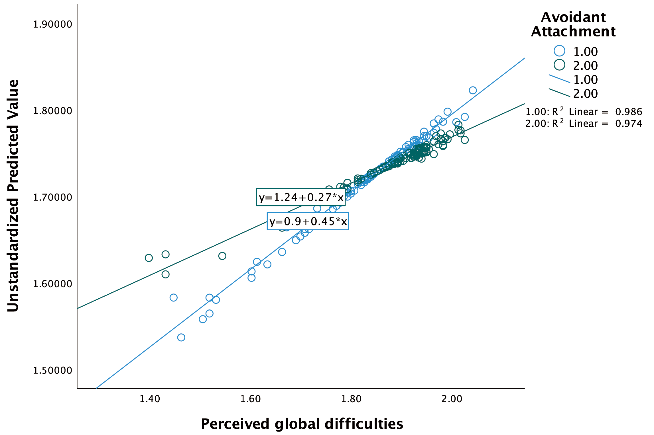 For the Moderation analysis linear regression analysis was used with trait-anxiety as dependent variable and covariates perceived global difficulties and interaction between perceived global difficulties and avoidant attachment. In order to visualize the moderation effect, scatter dot plot graph was computed by transforming the continuous avoidant attachment variable into a binary variable, having mean as threshold.