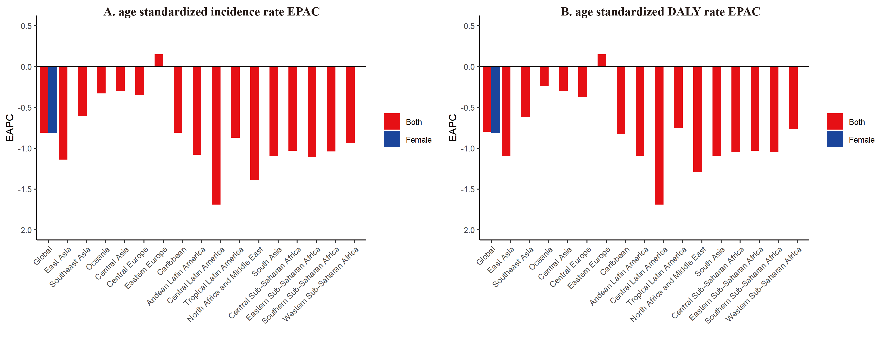 Fig. 1.The EAPC of endometriosis ASRs from 1990 to 2019, by sex and region. (A) The EAPC of ASIR. (B) The EAPC of age-standardized DALY rate. EAPC, estimated annual percentage change; ASRs, age-standardized rates; ASIR, age standardized incidence rate; DALY, disability adjusted life-year.