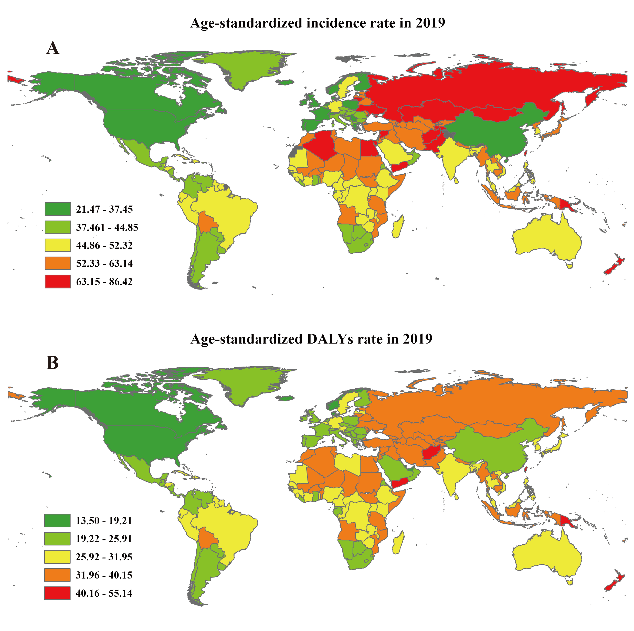 Fig. 2.The global ASRs of endometriosis in 204 countries in 2019, by countries. (A) The ASIR. (B) The age-standardized DALY rate. ASIR, age standardized incidence rate; DALY, disability adjusted life-year.