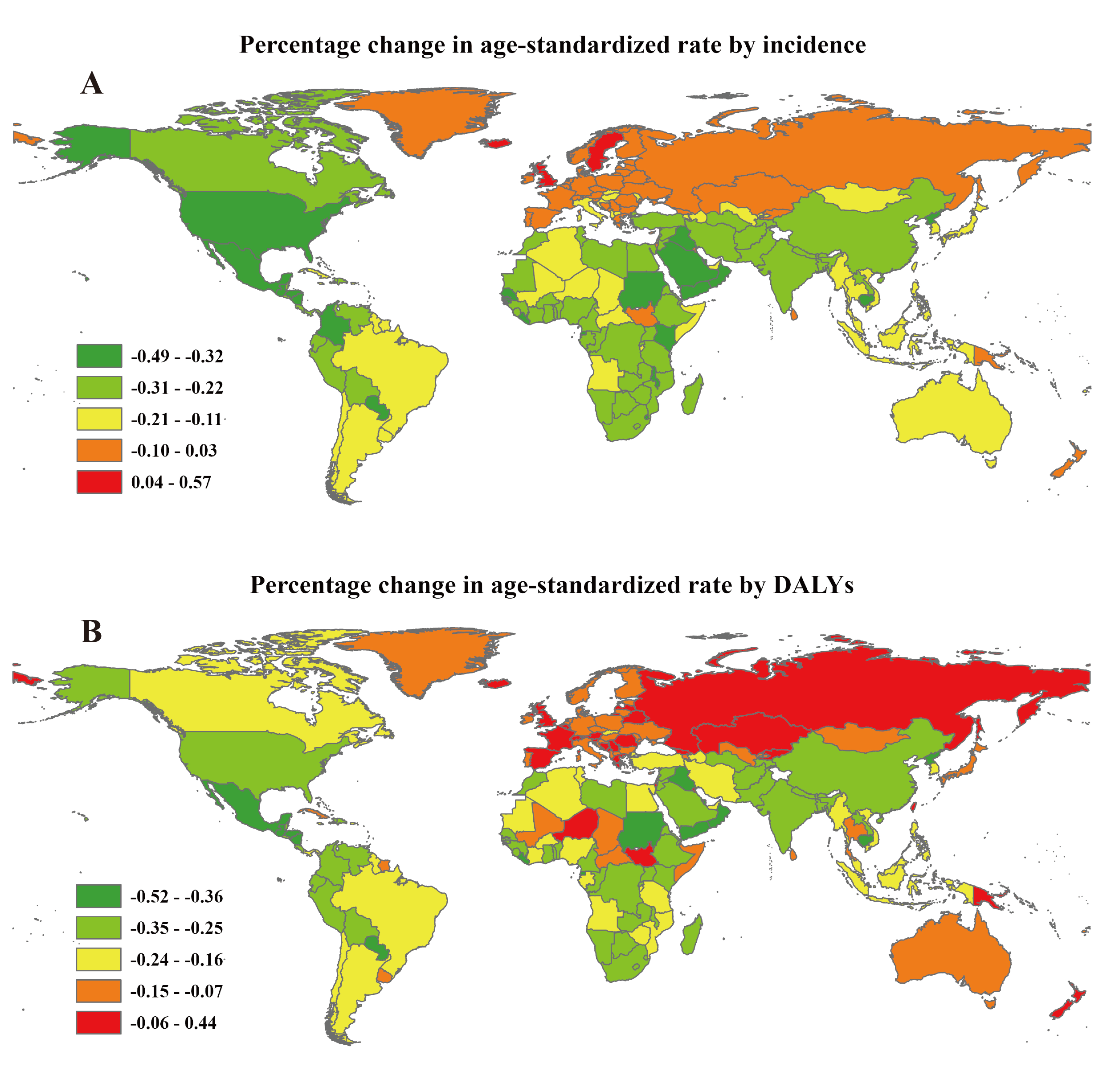 Fig. 3.The global EAPC of endometriosis ASRs from 1990 to 2019, by countries. (A) The EAPC of ASIR. (B) The EAPC of age-standardized DALY rate. EAPC, estimated annual percentage change; ASRs, age-standardized rates; ASIR, age standardized incidence rate; DALY, disability adjusted life-year.