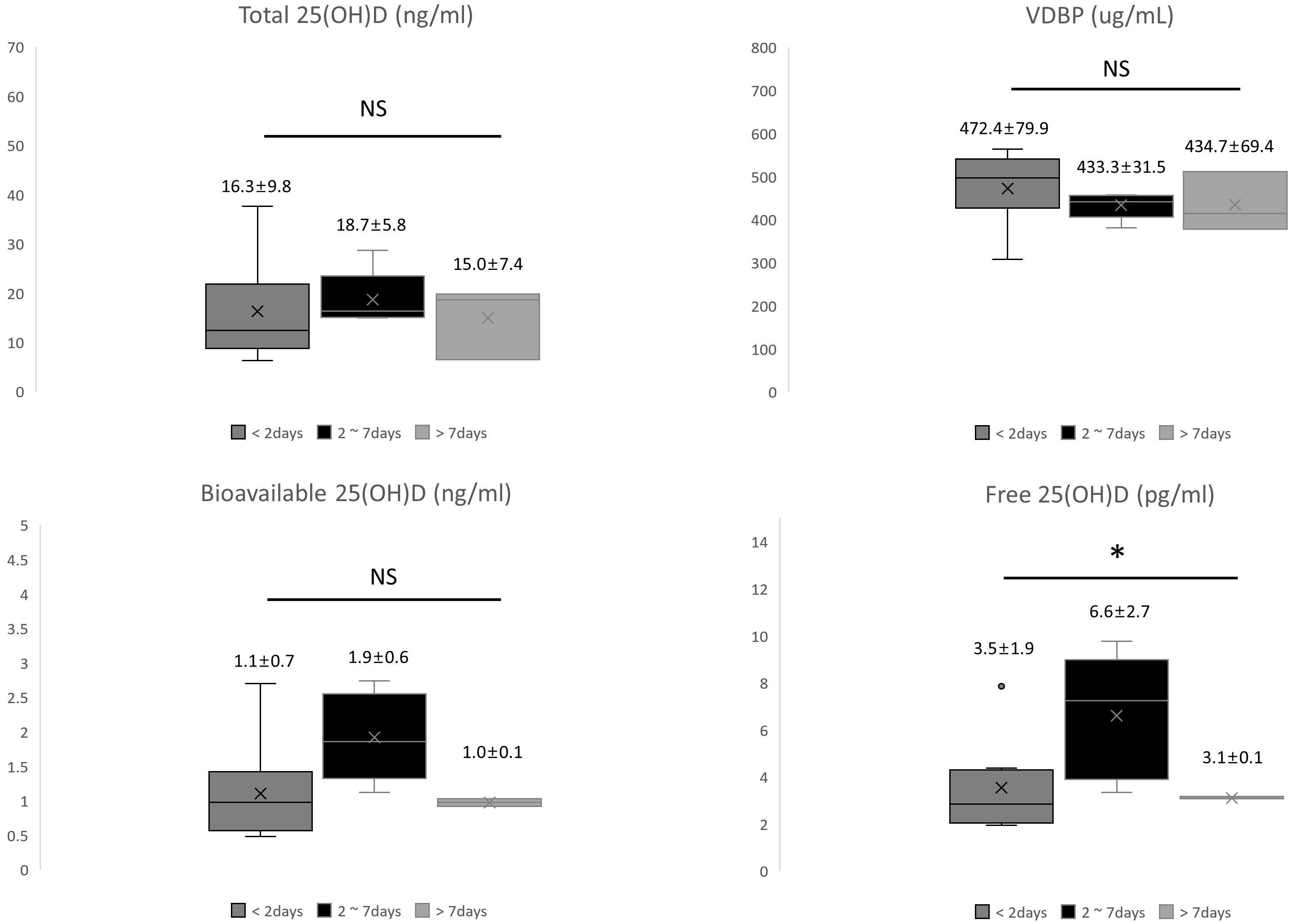 Fig. 1.Comparison of vitamin D biomarkers by the time interval from preeclampsia diagnosis to delivery. Abbreviations: VDBP, vitamin D-binding protein; NS, statistically not significant. *p = 0.032.