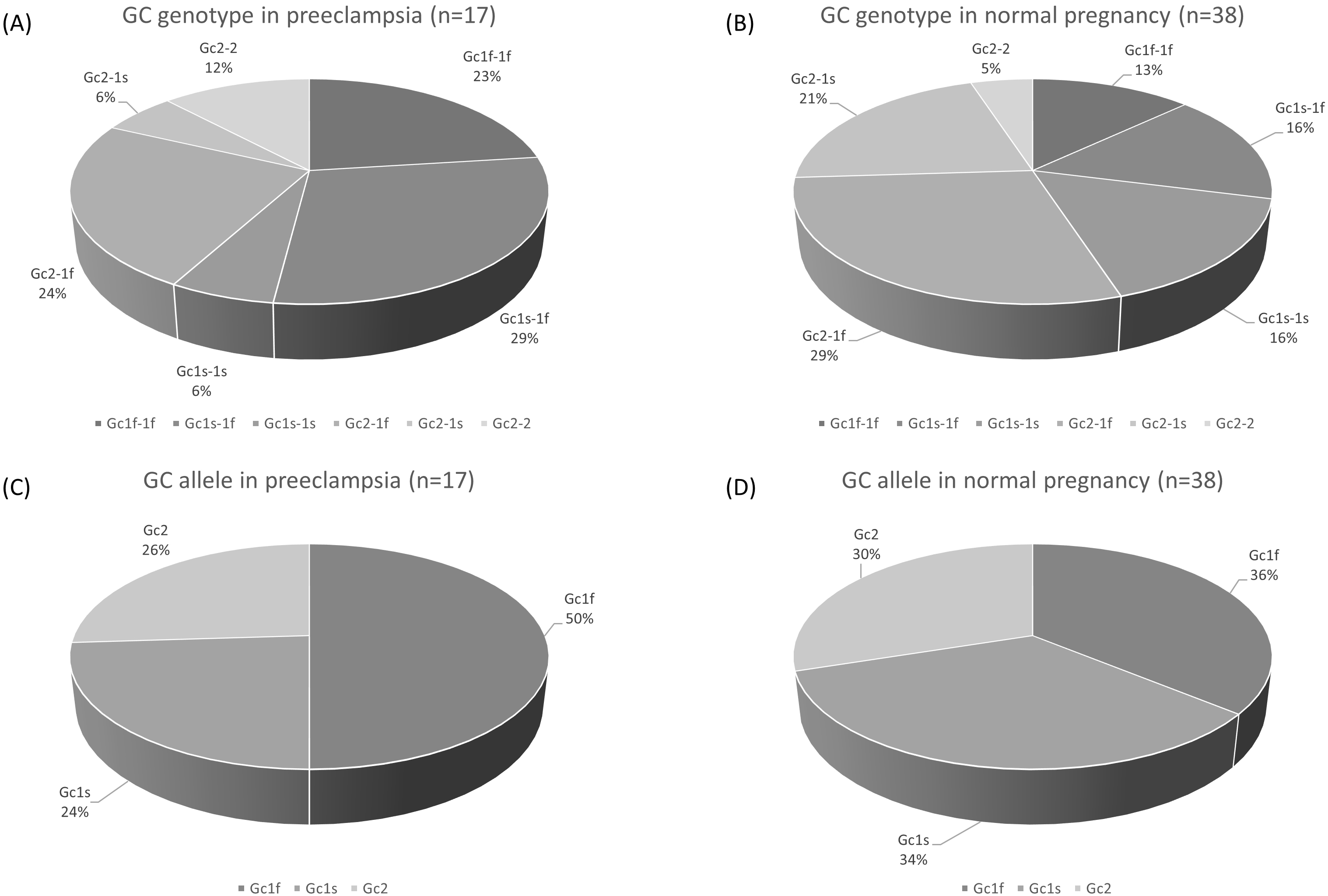 The genotype frequencies of GC in patients with preeclampsia and normal pregnancies are summarized in Fig. 2A,B. In the preeclampsia group, Gc1s-1f (29.0%), Gc2-1f (24.0%), and Gc1f-1f (23%) were detected in the order of the genotype with the highest frequency. In the normal pregnancy group, the most frequent genotype was Gc2-1f (29.0%), followed by Gc2-1s (21%). Three were no statistical differences in the genotype frequencies of GC between the preeclampsia and normal pregnancy groups (p = 0.397).