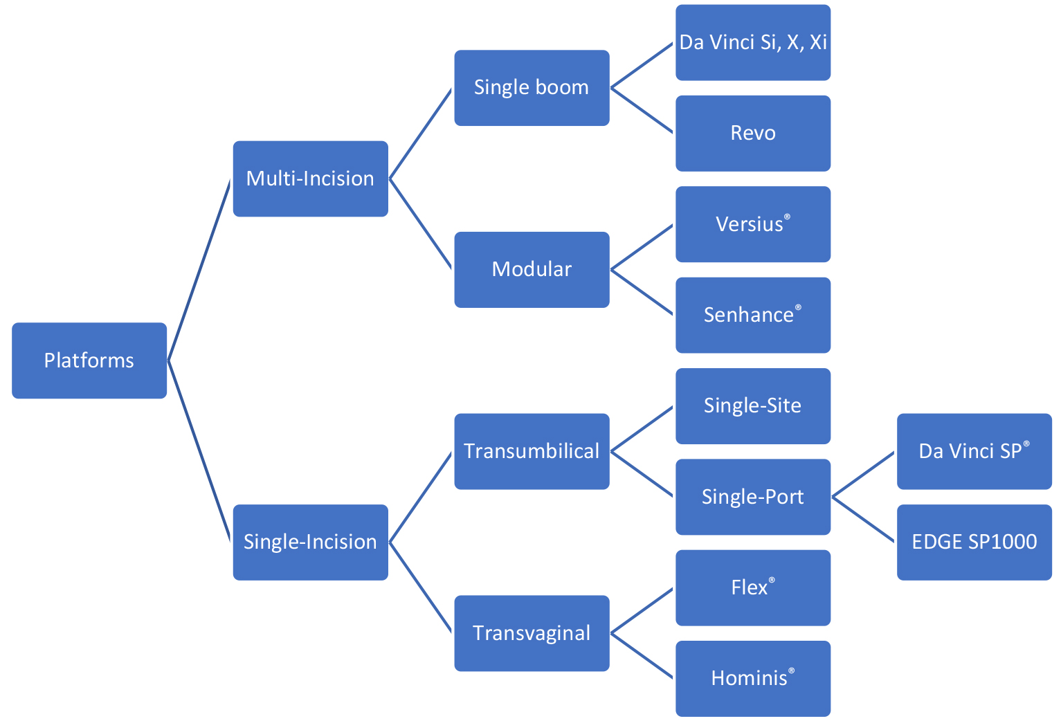 In this review, we describe Multi-Incision and Single-Incisionrobotic platforms. The former group encompasses Single-Boom platforms, which include Da Vinci Si, X, Xi, and Revo-I, and Modular platforms that include the innovative Versius® and Senhance®. In the latter group, we found systems that used either the Transumbilical approach, such as Da Vinci SS, Da Vinci SP®, and EDGE SP1000, or the Transvaginal approach, such as the Flex® and Hominis® robotic systems (Fig. 1).
