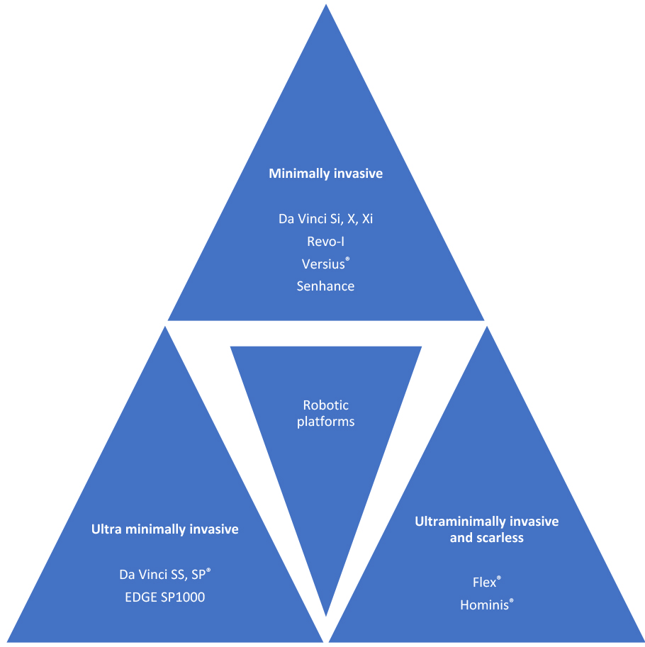 Da Vinci Si, X, and Xi allow safe and effective performance of small multi-incision robot-assisted laparoscopic gynecological surgery, but surgical innovation has tackled some of its drawbacks through the introduction of Revo-I, Versius®, and Senhance® robotic platforms. The development of Da Vinci Single-Site and Single-Port achieved less invasiveness through the use of a single-site transumbilical incision. Nevertheless, the innovative technology introduced by Flex® and Hominis® robotic systems may allow gynecological surgeons to achieve the golden goal of ultra-minimally invasive scarless surgery.