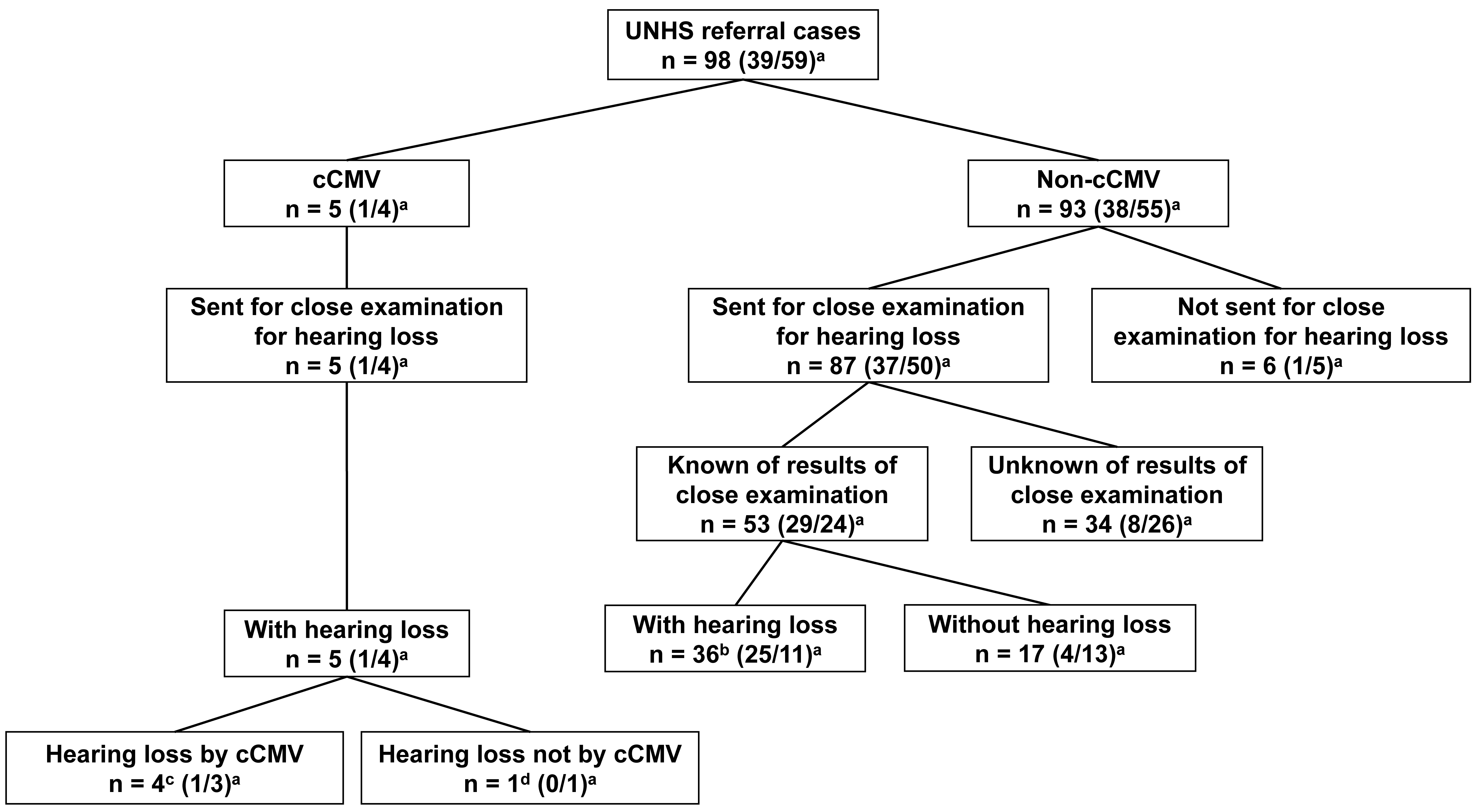 Herein, we performed a prospective enrollment study of neonatal patients who had referral results in UNHS. Therefore, since there was no enrollment at the time of undergoing UNHS, the exact number and clinical characteristics of neonates who underwent UNHS could not be reported. However, in another study of pregnant women (cytomegalovirus antibodies), along with those included in this study, the number of pregnant women enrolled during the same study period was 44628. Therefore, we assume that approximately the same number of neonates received UNHS. Assuming that approximately 4–5 of 1000 neonates failed at the UNHS [4], about twice as many neonates as the 98 patients in this study would have been considered to have had referral results. The reason for this small number of patients with referral results would be that, UNHS was not performed when mothers did not wish to receive the test, because some patients were sent to the otorhinolaryngologists even after obtaining UNHS referral results without enrollment in this study and their urine samples were not collected. Moreover, in the assessment of the incidence rate of cCMV infection in UNHS referral patients, selection bias to an extent might be present in this study population. We performed neonatal CMV DNA tests from urine samples in all UNHS referral patients; however, we were not able to obtain all of the corresponding CMV antibody screening results from the mothers. Thus, although we identified the incidence rate of cCMV infection among all UNHS referral patients, we showed the incidence rate of maternal primary CMV infection in a limited number of patients (60 of 98 mothers). This could also contribute to a selection bias in this study.