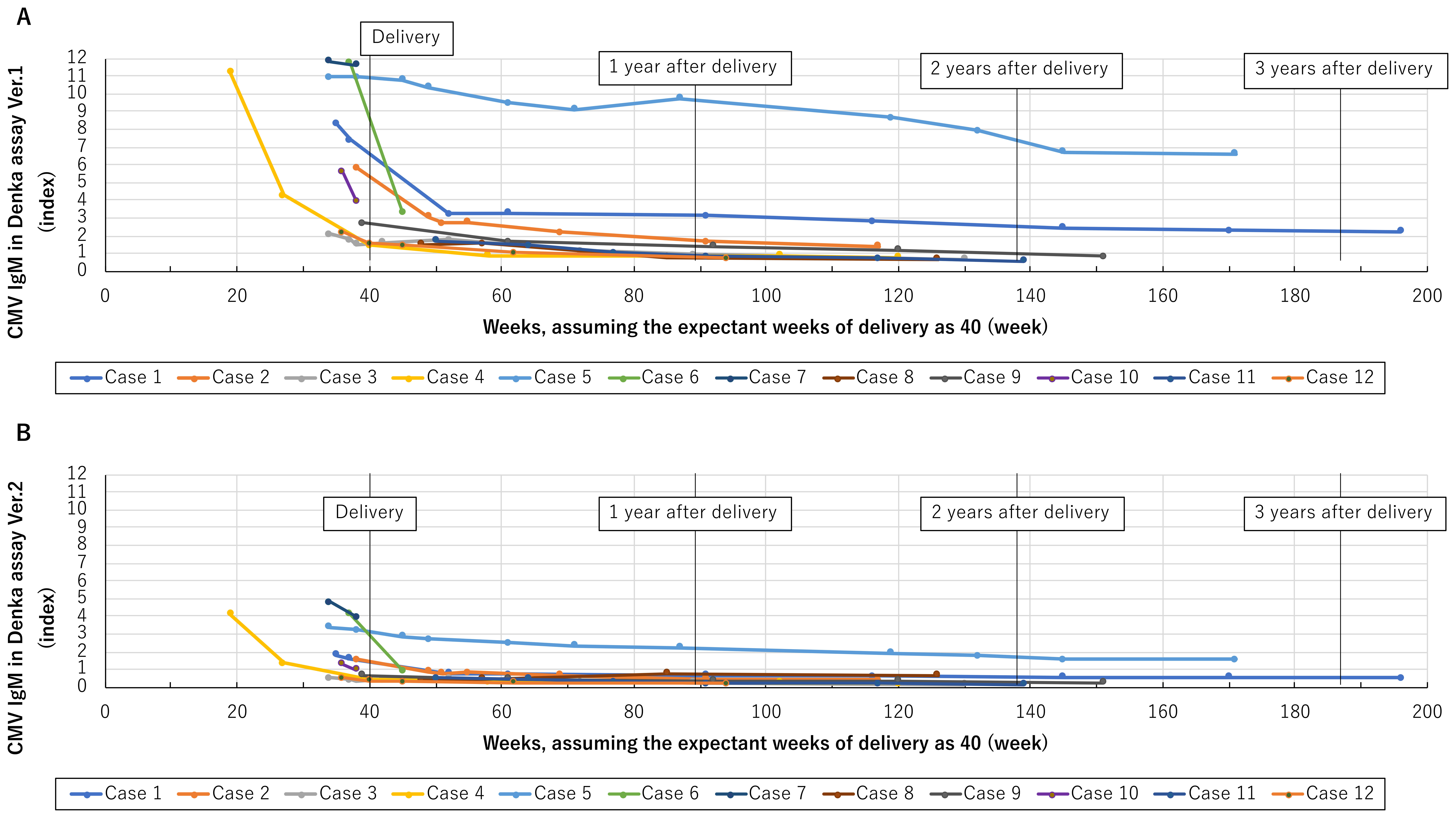 CMV IgG increased until 61 weeks and did not change significantly afterward, except in in case 8 (Supplementary Fig. 1). CMV IgM decreased until 52 weeks and did not change significantly after that in both Denka IgM assays. Only case 5 showed a continuous decrease after 50 weeks (Fig. 1).