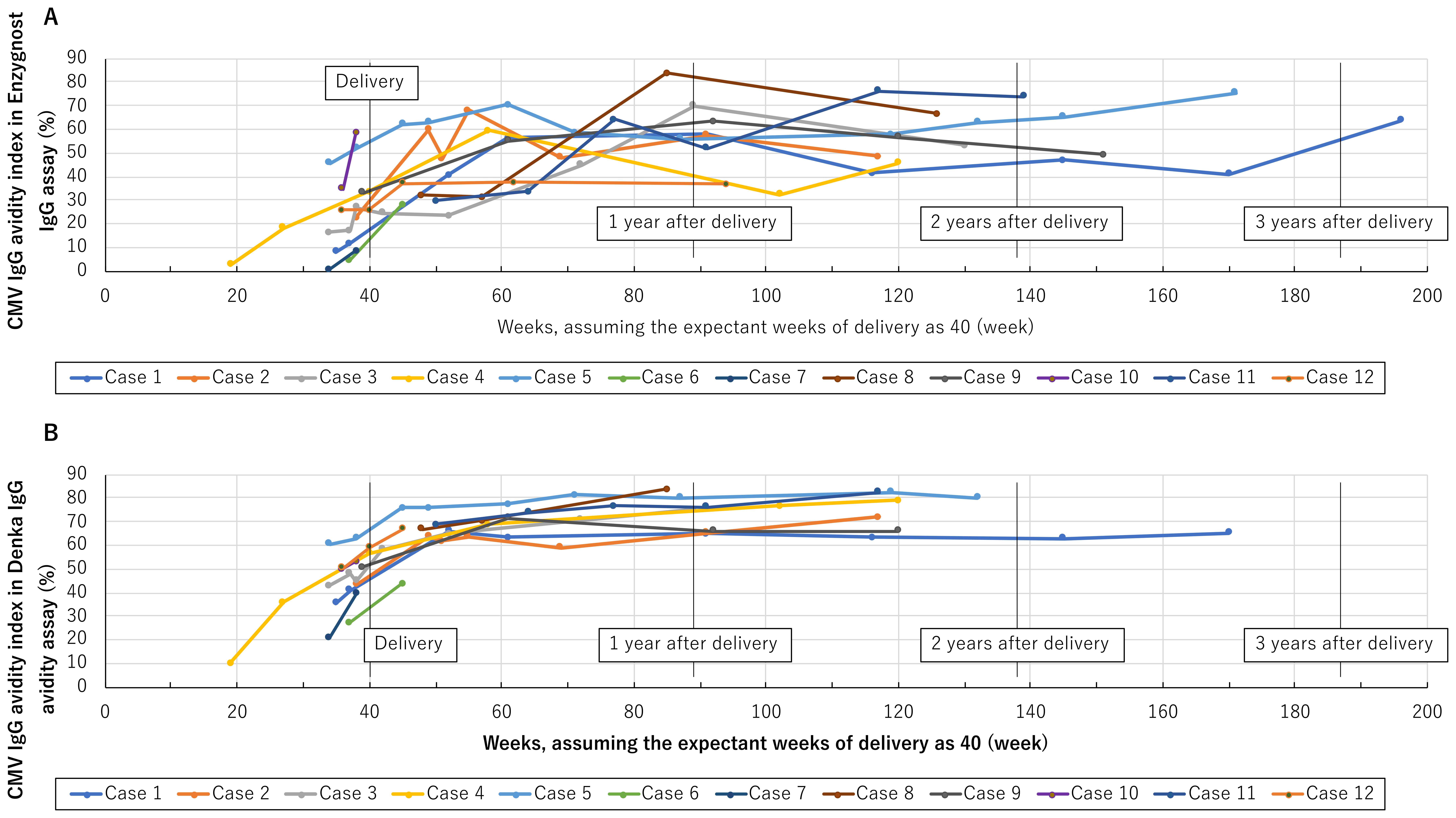 Fig. 2.Dynamics of cytomegalovirus immunoglobulin (Ig) G avidity. (A) Dynamics of IgG avidity in the Enzygnost IgG assay (n = 67). (B) Dynamics of IgG avidity in the Denka IgG avidity assay (n = 58). IgG, Immunoglobulin G.