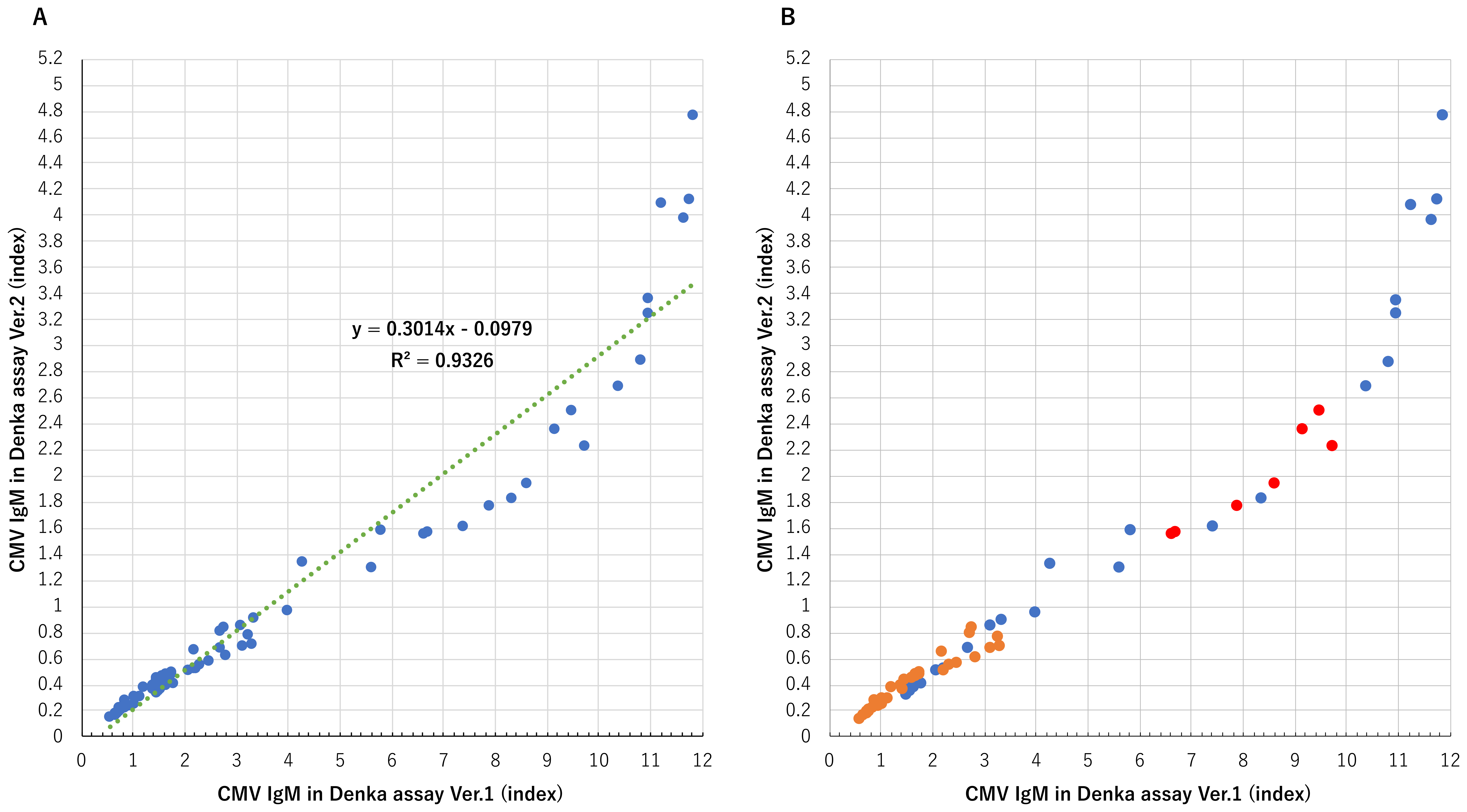 Fig. 3.Correlation of cytomegalovirus immunoglobulin (Ig) M between the Denka IgM assays. (A) Correlation of IgM between the Denka IgM assays Ver.1 and Ver.2. (B) Color separation into two phases (early phase: before 60 weeks and late phase: after 60 weeks). In B, blue and orange circles are plots of the early and late phases, respectively. Red circles are plots of late phase in the exceptional case (Case 5). IgM, Immunoglobulin M.
