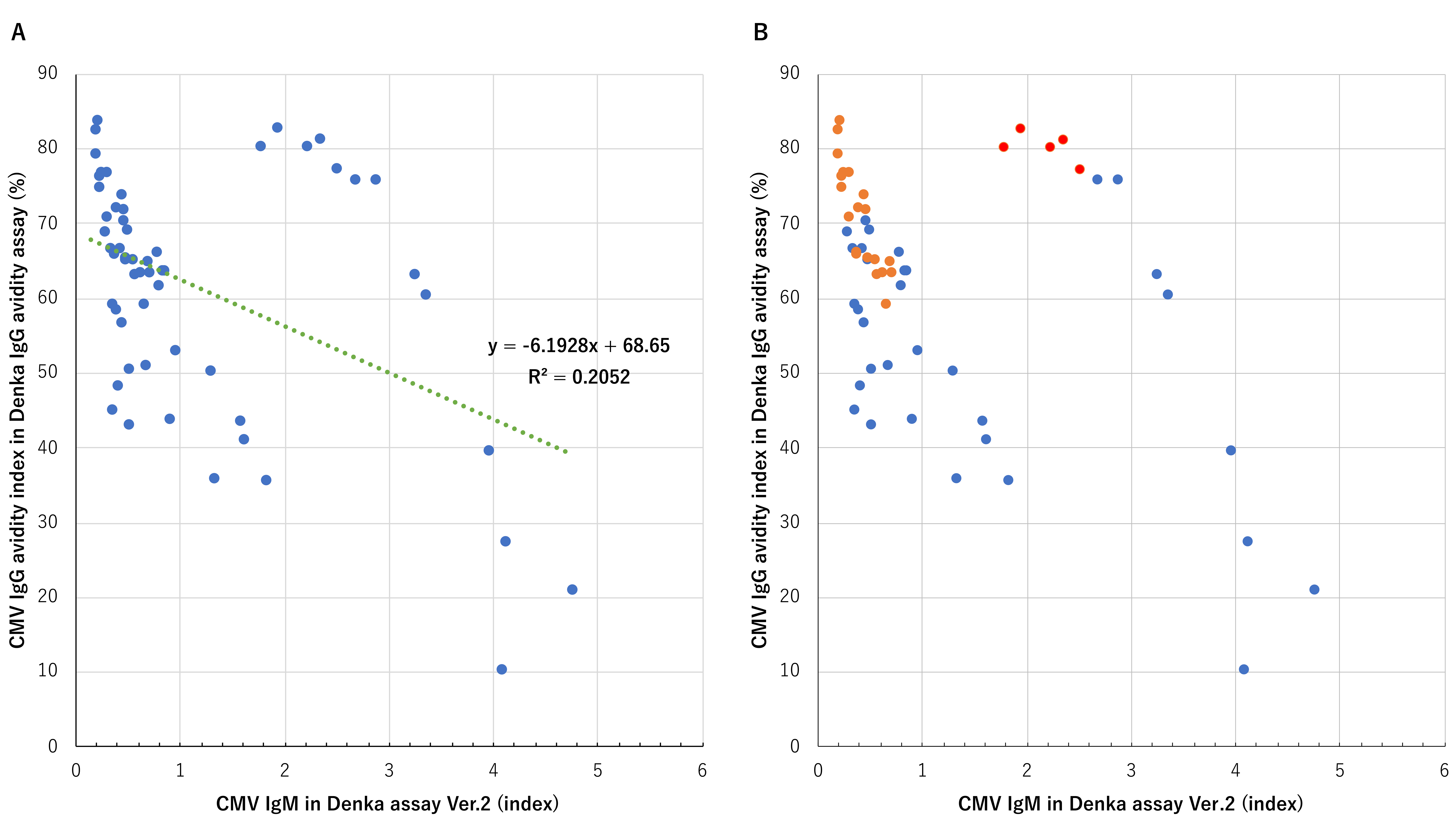 Fig. 4.Correlation between cytomegalovirus immunoglobulin (Ig) M and IgG avidity. (A) Correlation between IgM in the Denka IgM assay Ver.2 and IgG avidity in the Denka IgG avidity assay (n = 58). (B) Color separation into two phases (early phase: before 60 weeks and late phase: after 60 weeks) (n = 58). In B, blue and orange circles are plots of the early and late phases, respectively. Red circles are plots of the late phase in the exceptional case (Case 5). IgM, Immunoglobulin M; IgG, Immunoglobulin G.