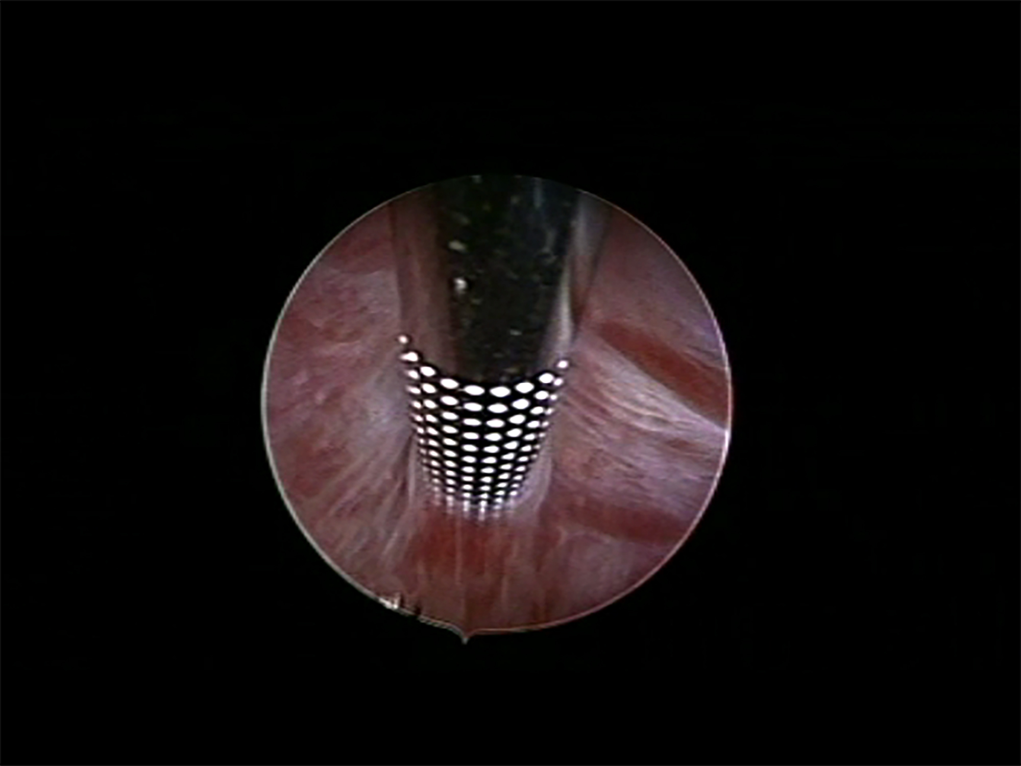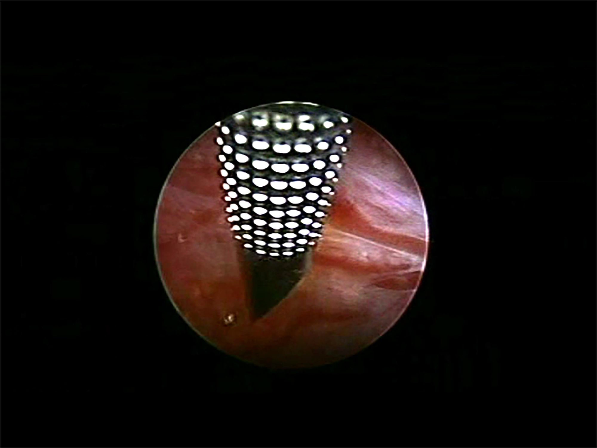 Fig. 1.The tip of the 17-gauge needle inserted in the operative channel of a 5-mm operative hysteroscope is shown within the coelomic space of a type 2 Cesarean Scar Pregnancy, before Methotrexate sub-chorionic administration.