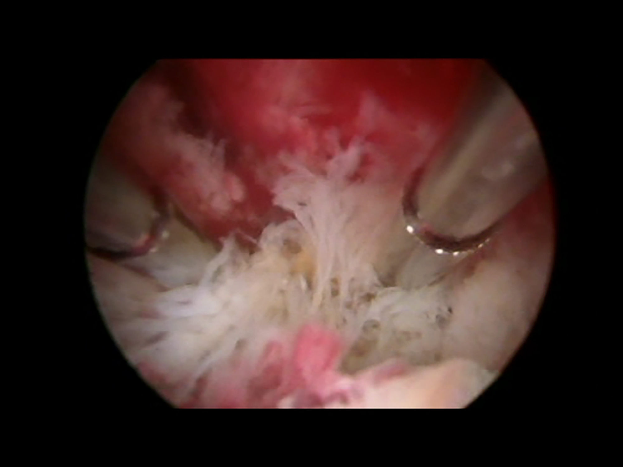 Fig. 3.Resectoscopic removal of CSP after hysteroscopic sub-chorionic administration of Methotrexate. The cleavage plane between the cervico-isthmic uterine niche (pinkish tissue) and villous trophoblast (blanching tissue) is developed by blunt loop separation.