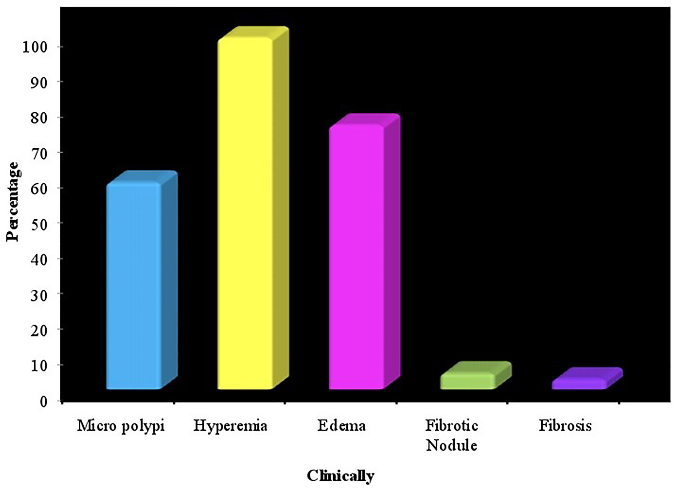 The study was conducted on 220 women with complaints of primary infertility scheduled for the first attempt of ICSI. There was no drop out as the two procedures (office hysteroscopy and endometrial biopsy) were done in the same setting. Patient age ranged from 20–40 years, mean 29.99 ± SD 5.10 years. 174 cases (79.1%) were diagnosed as CE at hysteroscopy (Table 1), while 162 (73.6%) cases were positive at histopathology (Table 2). Fig. 1 shows hyperaemia which was found in 99.4% of the cases of CE, followed by oedema which was present in 74.7% of cases. Micropolypi were found in 58.6% of cases with CE. Fibrotic nodules and fibrosis or filmy adhesions were seen in only 4.6% and 2.9% of cases with CE, respectively. The different hysteroscopic findings are shown in Fig. 2. The sensitivity, specificity, and positive and negative predictive values of hysteroscopy were 93.83%, 62.07%, 87.36% and 78.26%, respectively (Table 3).