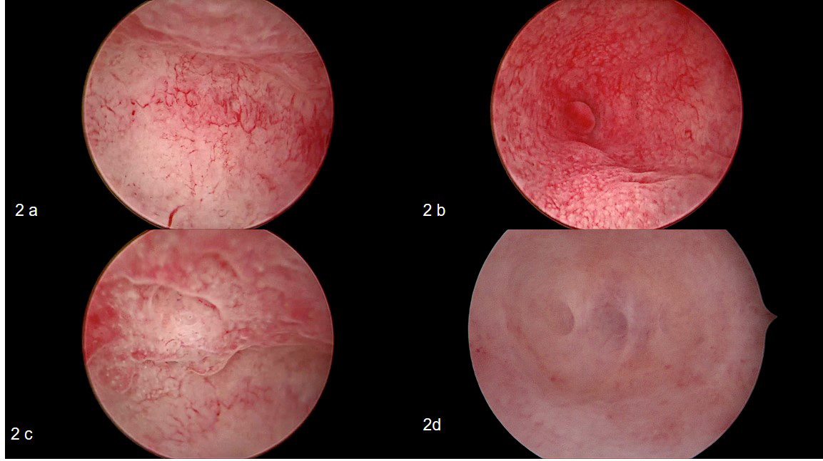 Different appearance of chronic endometritis during office hysteroscopy. (a) hypervascularity, (b) micropolyp near right ostia, (c) endometrial oedema and hyperaemia, and (d) endometrial filmy adhesions separated by fluid gush.