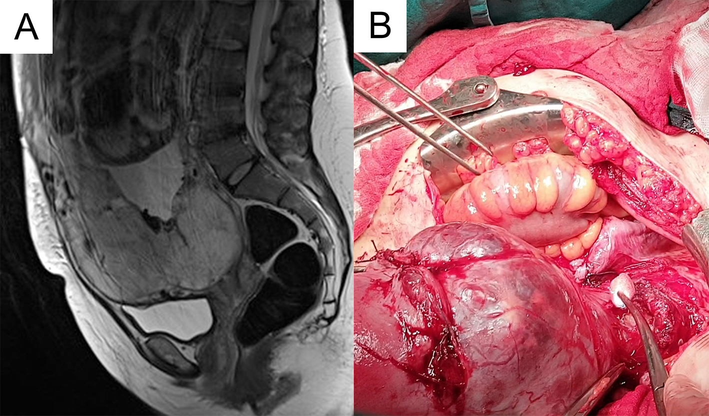 Fig. 1.Preoperative magnetic resonance imaging and intraoperative findings. In the sagittal plane, sequence MR FIESTA T2 is visible placenta previa and superficial invasion in the bladder (A). The placenta was reaching throughout the myometrium and extending the posterior surface of the bladder (B).