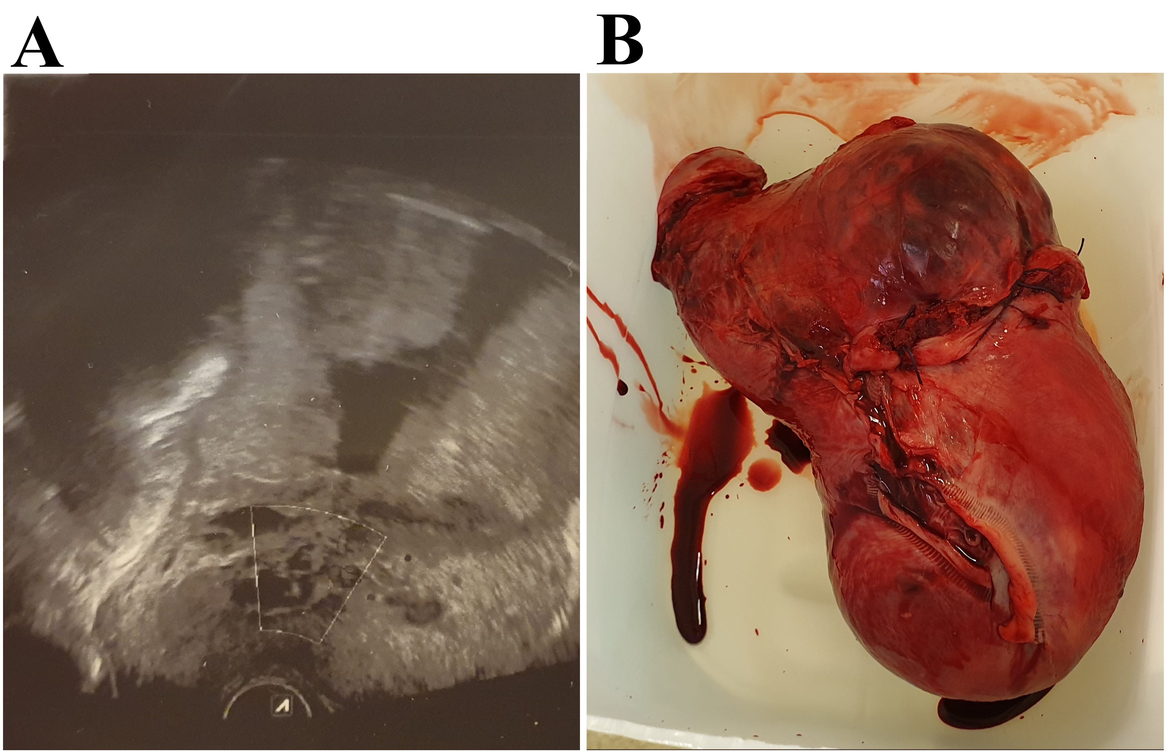 Fig. 2.Preoperative 2D transvaginal ultrasound image and the uterus after a total hysterectomy. 2D transvaginal ultrasound showed the absence of placental-myometrial interface and the existence of multiple vascular intraplacental lacunae (A). Uterus with the placenta in situ after a total hysterectomy (B).