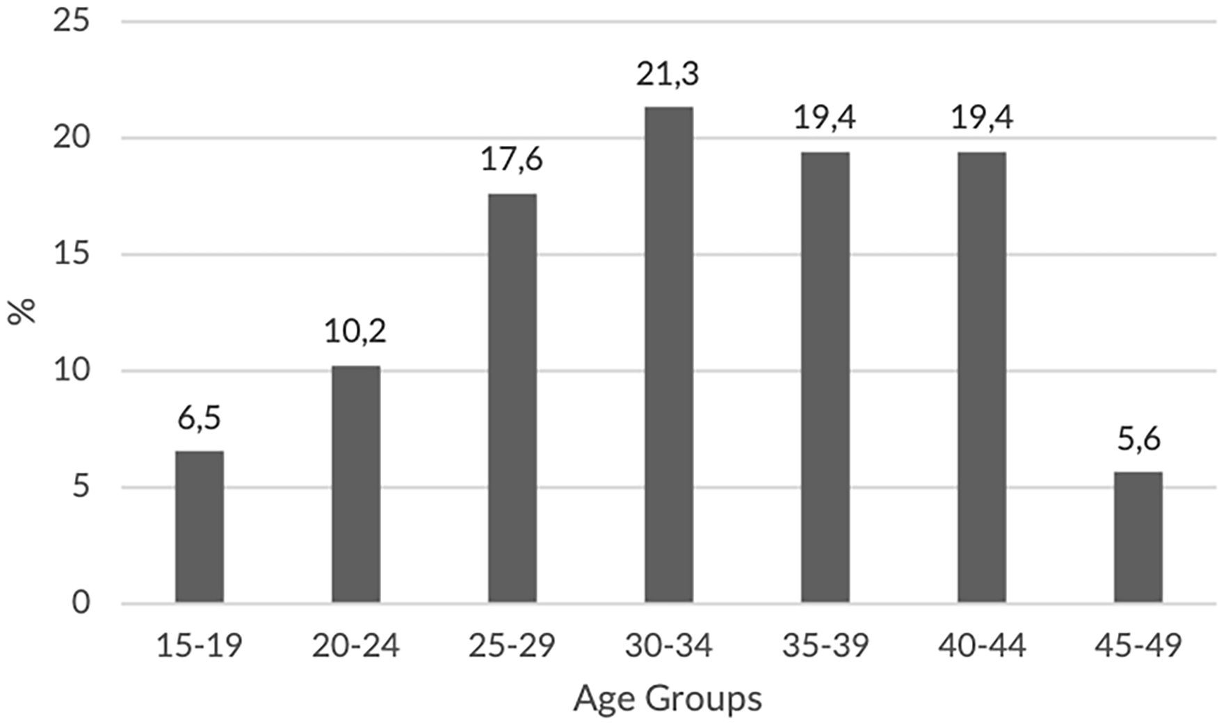 With regard to women’s age, the class with the highest number of consultations was 30–34 years (21.3%). The distribution by age groups can be seen in Fig. 1.