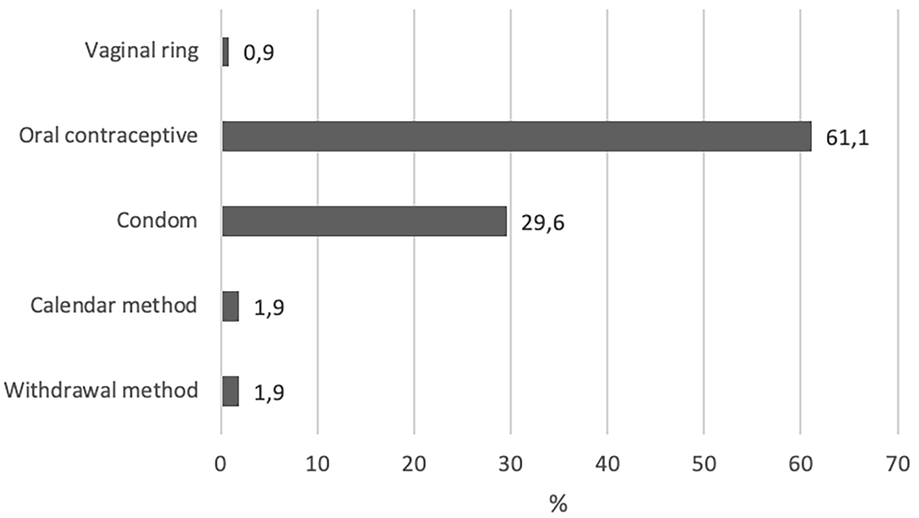 Despite all the information available, 5% did not use contraception prior to consultation. Although surprising, this fact is in line with the available literature. 3.8% of women used natural methods (withdrawal or calendar method). This percentage is relatively higher than that reported in the last study carried out in the country (0.7%) [7]. Currently, there are no studies on this topic, but several press articles have referred to this trend in the millennial generation.