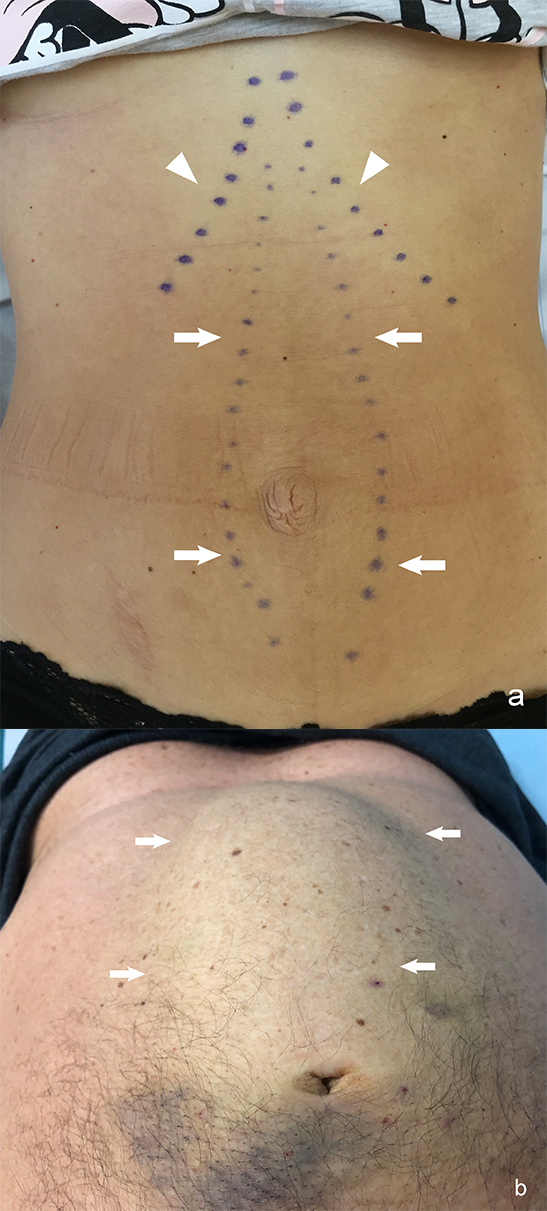 Fig. 1.Diastasis recti abdominis (DRA) in relaxed state. (a) During curl up. (b) Arrows–medial margins of rectus muscles; arrowheads–costal arches.