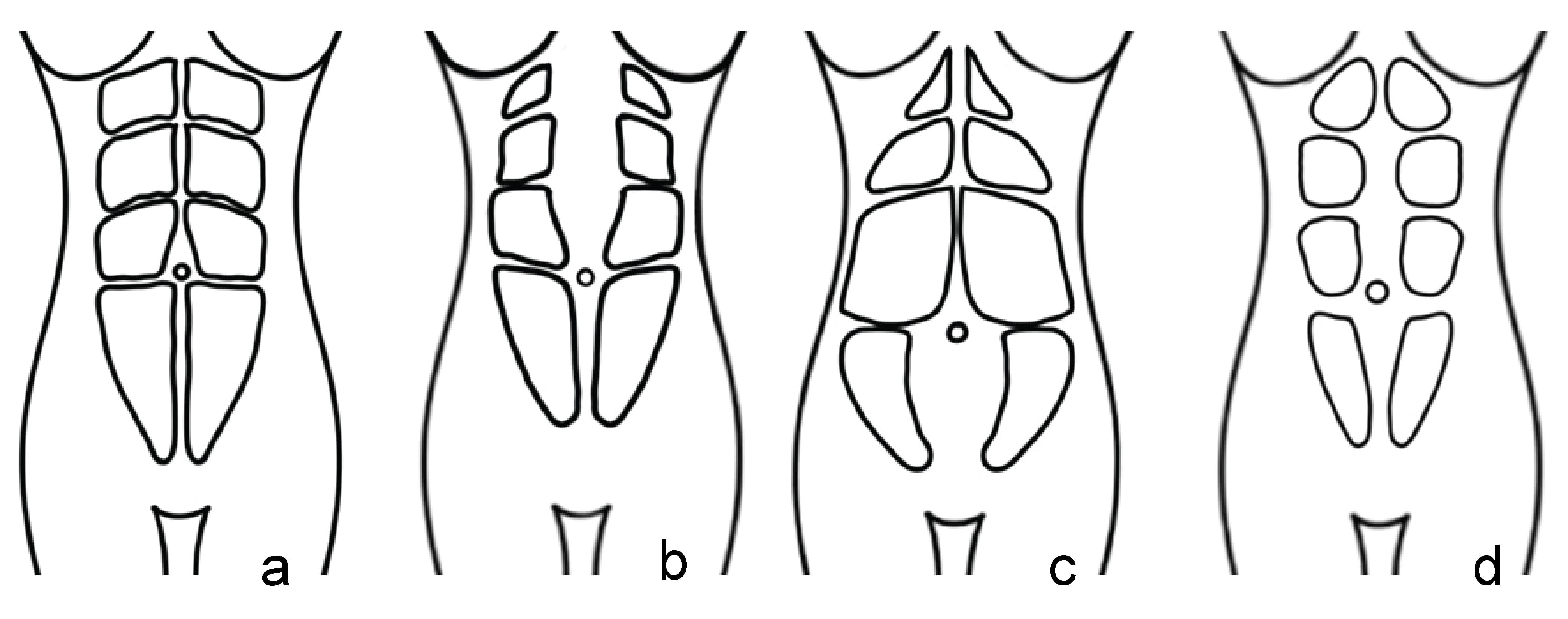 Fig. 2.Rectus abdominis muscles: correct position. (a) Above-navel DRA. (b) Below-navel DRA. (c) DRA along the full length of the linea alba. (d) DRA–diastasis recti abdominis.