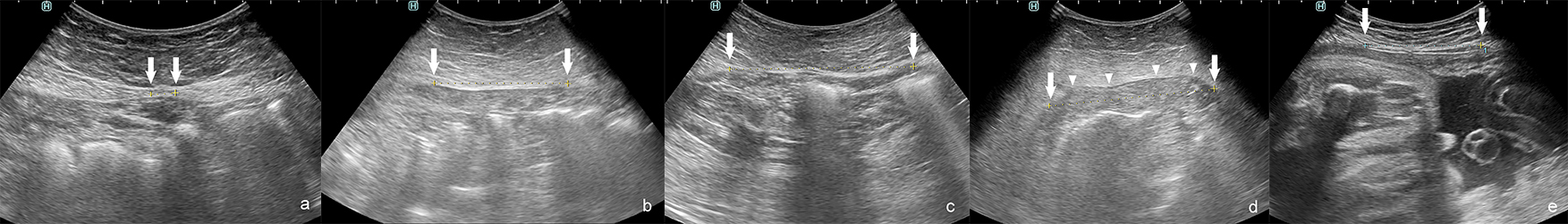Fig. 3.Interrecti distance (IRD) measured by ultrasonography: correct IRD 8 mm. (a) Examples of diastasis recti abdominis (DRA). (b–e) IRD 66 mm. (b) IRD 74 mm. (c) IRD 82 mm during curl up. (d) IRD 52 mm in pregnant woman. (e) Arrows–medial margins of rectus muscles, arrowheads–protruded linea alba during curl up.