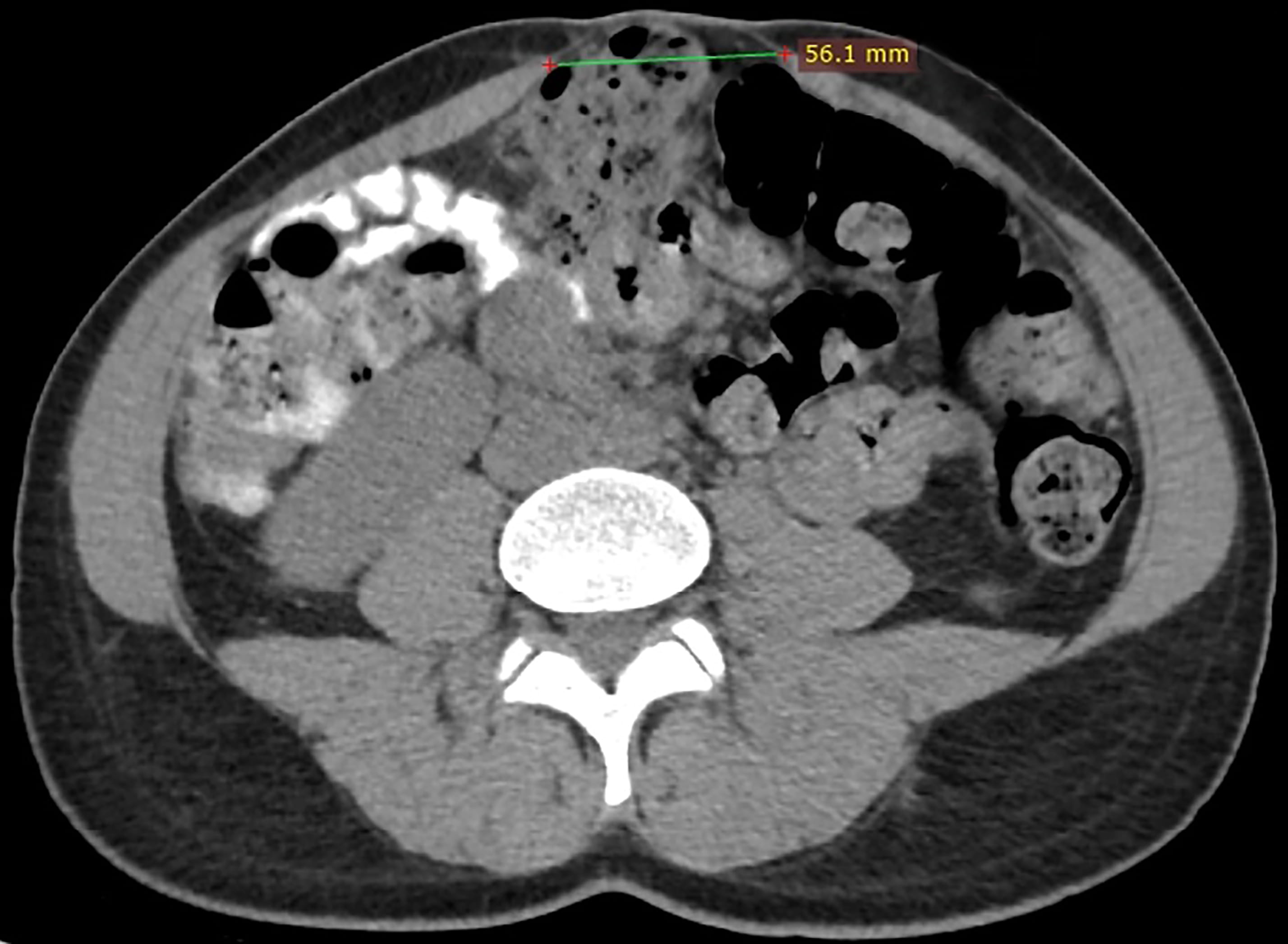 To diagnose the presence of DRA and its severity the interrecti distance (IRD) is measured [4]. Palpation, caliper, ultrasound (Fig. 3), CT (Fig. 4) and MR are used to measure IRD [2, 4]. To date there is no consensus which method should be applied. Swedish national guidelines recommend diagnosis using caliper or ruler for measurement. Ultrasound or other imaging modality is recommended when concomitant hernia is suspected [7]. Corvino et al. [17] promote the use of dynamic ultrasound in case of suspected hernia. They point that computed tomography is a static examination, while dynamic ultrasound could demonstrate the movement of abdominal contents [17]. The finger-width method is widely used, as it is economical and relatively convenient [2]. However, ultrasound, CT or MR to measure IRD are more accurate and may exclude any concurrent ventral hernia [2, 6].