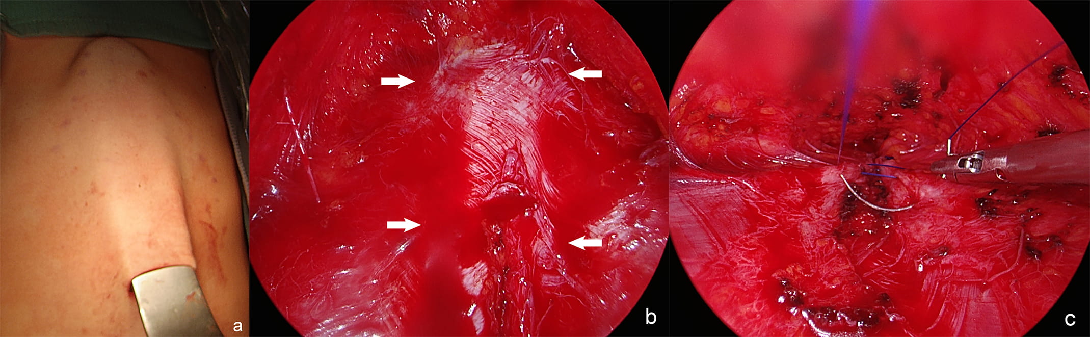 Fig. 5.Endoscopic assisted approach for DRA: the retractor lifts the skin above the linea alba. (a) Endoscopic view of the supra-aponeurotic space and exposure of the linea alba. (b) Plication of the anterior rectus sheath with continuous suture. (c) DRA–diastasis recti abdominis, arrows–medial margins of rectus muscles.