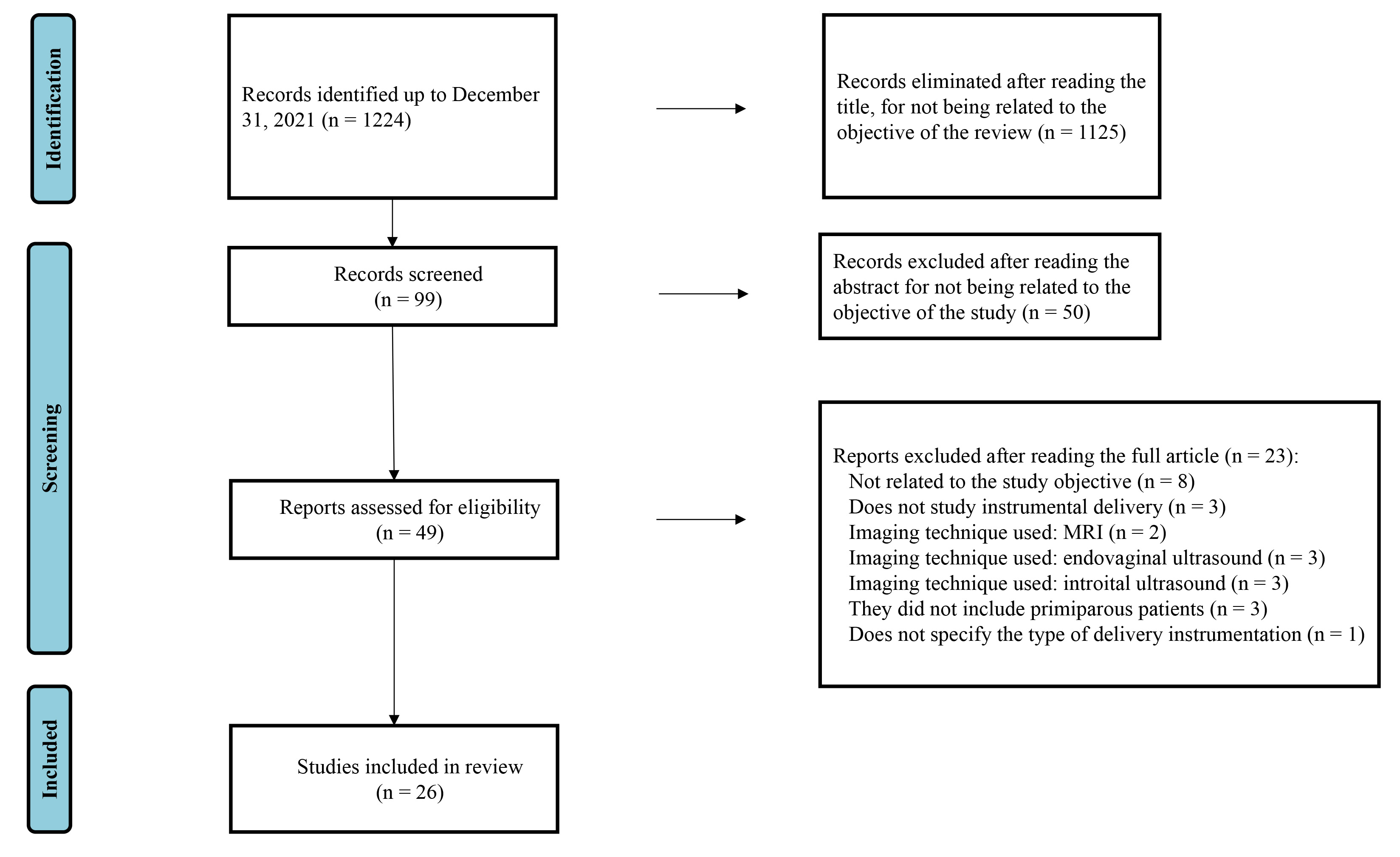 The search included 1225 studies that met the MeSH criteria, of which 26 were included in the review because they met the inclusion criteria (Fig. 1). Of all the excluded studies, we highlight the study by Greenbaum et al. [10] which, although it met the inclusion criteria, was excluded because it did not mention the type of instrumentation performed during vaginal delivery.