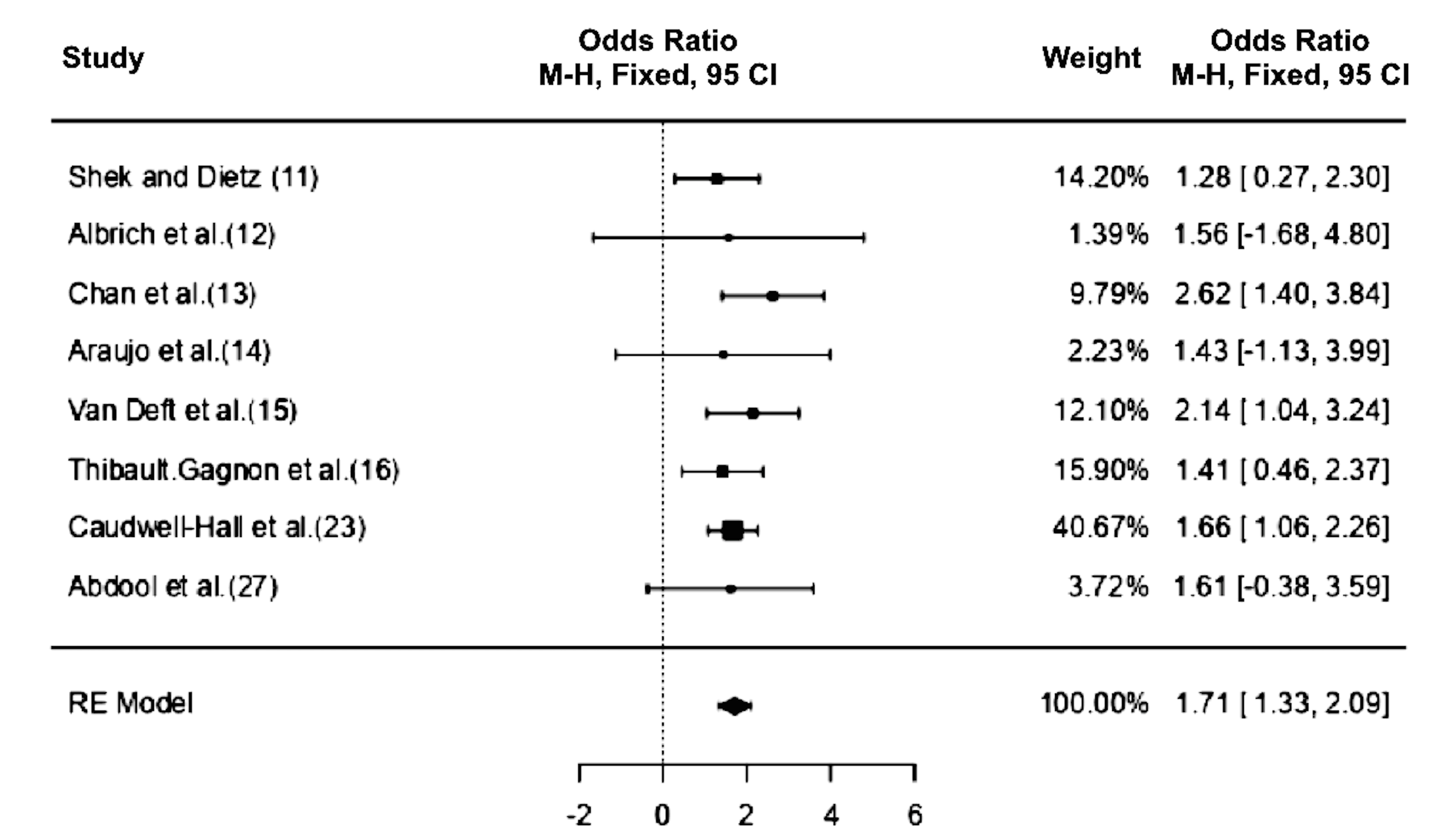 studies included, log odds ratios ranged between 1.28 and 2.62, the majority