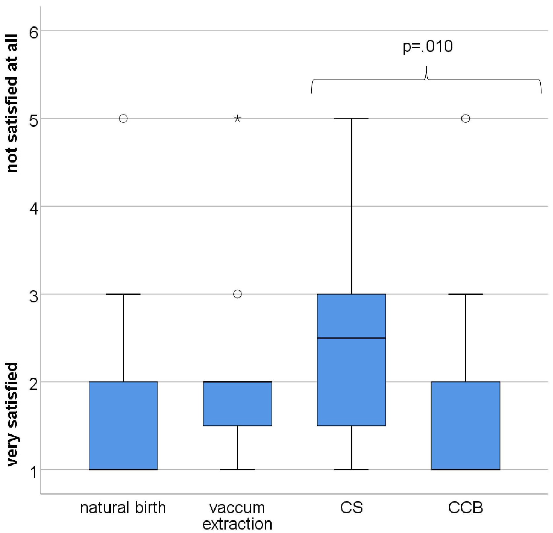 Upon questioning at the mother-child ward, women who received a CCB were significantly more satisfied with their birth experience than women who received CCS: 1 out of 6 (IQR 1–2) vs. 2.5 out of 6 (IQR 1.25–3) (p = 0.010) (Fig. 2). Ordinal logistic regression was performed with adjustment for sociodemographic variables that differed between CCB and CCS in univariate analysis (country of birth and religion), revealing that mode of CD was the only significant predictor of birth satisfaction: ordered log-odds (estimator) of –2.7 (p = 0.009). The CCB and vaginal birth groups did not significantly differ in birth satisfaction: 1 (IQR 1–2), p = 0.491) (Fig. 2). Again, with adjustment for the sociodemographic variables that differed between vaginal birth and CCB (age and gestational age), mode of delivery did not significantly influence birth satisfaction between the two groups: ordered log-odds (estimator) of –0.157 (p = 0.740). Among women who underwent unplanned CD, those who received unplanned CCB were significantly more satisfied than women who received unplanned CCS: 1 (IQR 1–2) vs. 3 (IQR 3–3) (p = 0.040). Again, we found no difference between women who received unplanned CCB vs. vaginal birth.
