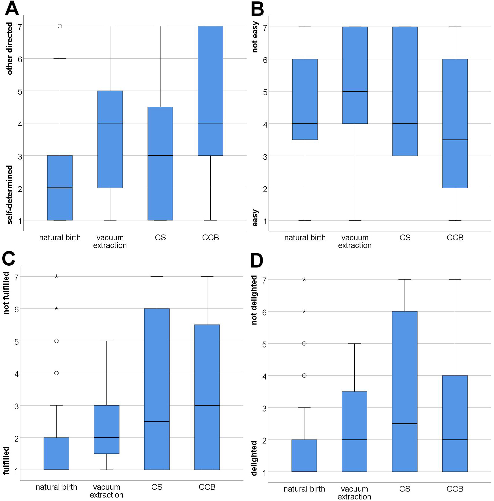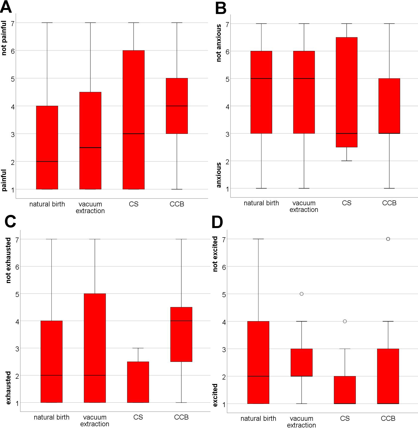 | Variable | Scale | Vaginal birth | Vacuum extraction | Conventional CS (CSS) | Charité Caesarean Birth (CCB) | Total | p (vaginal vs. CD) | p (CCS vs. CCB) |