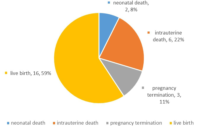 Fig. 2.Outcome of pregnancies for the group of fetuses complicated with AV block.