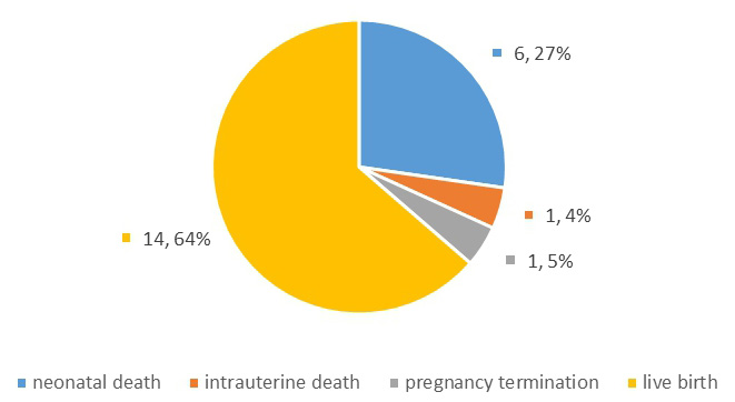 The analysis of the total number of monitored fetuses-neonates showed that this study included 102/127 live births (80.31%), termination of pregnancy in 10/127 of pregnant women (7.87%), intrauterine fetal death in 7/127 fetuses (5.51%) and death during the neonatal period in 8/127 fetuses (6.3%) (Table 3).