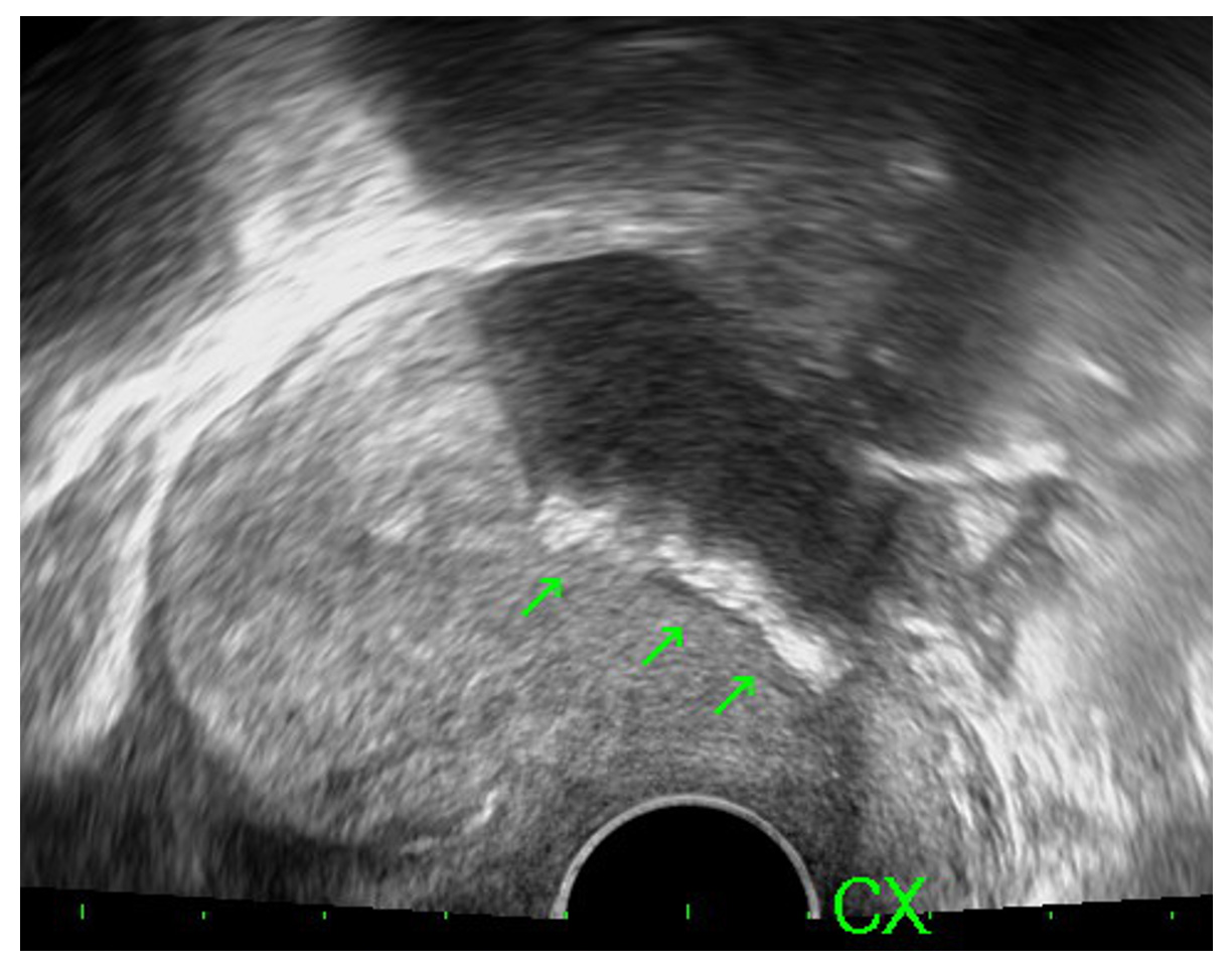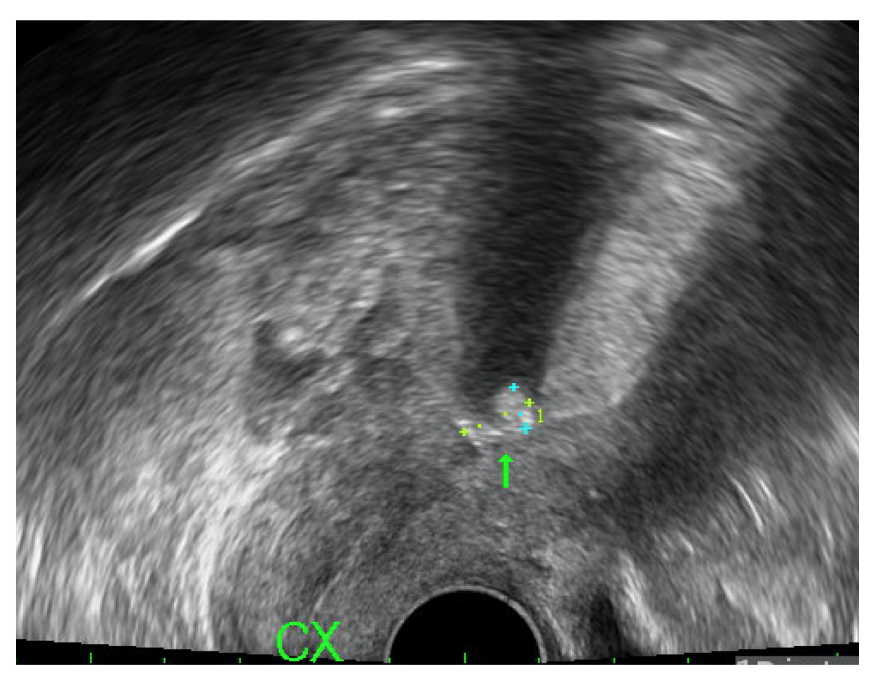 Fig. 1.Ultrasound revealed an irregularly shaped strip of hyperechoic lesions (length: 2.92 cm) located in the mid-portion of the uterine cavity and extending into the isthmus.