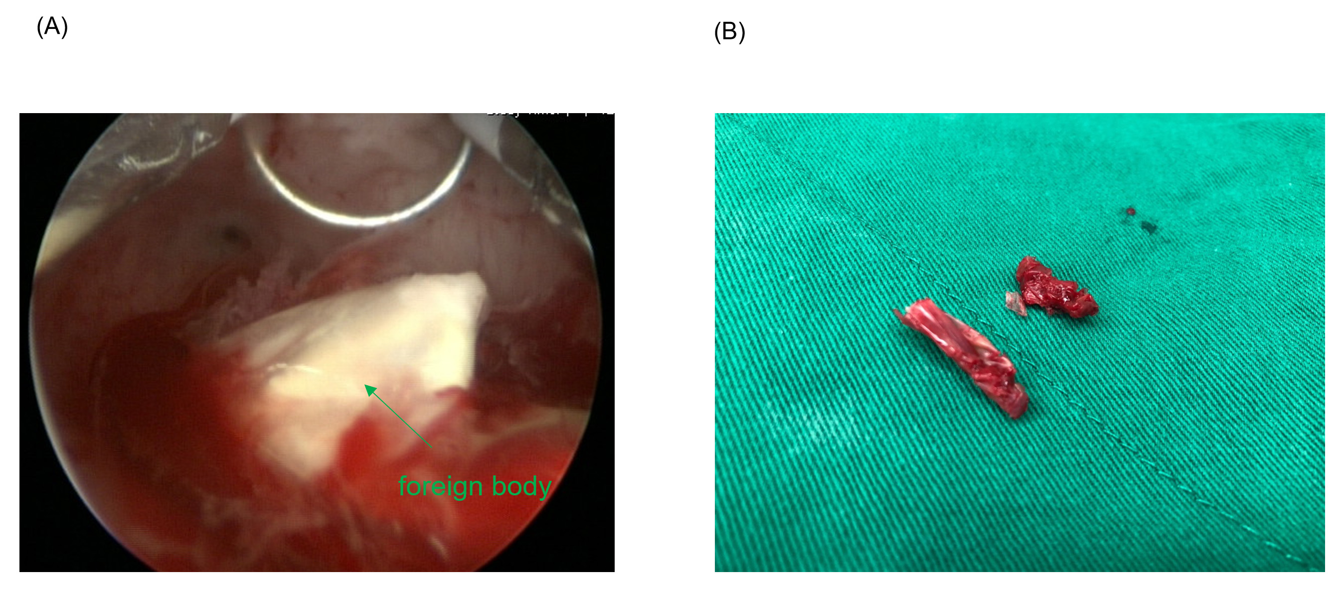 Fig. 2.Diagnostic hysteroscopy. (A) On hysteroscopy, a foreign body presenting as a flattened bundle was seen within the uterine cavity. (B) Gross morphology of the removed specimen.
