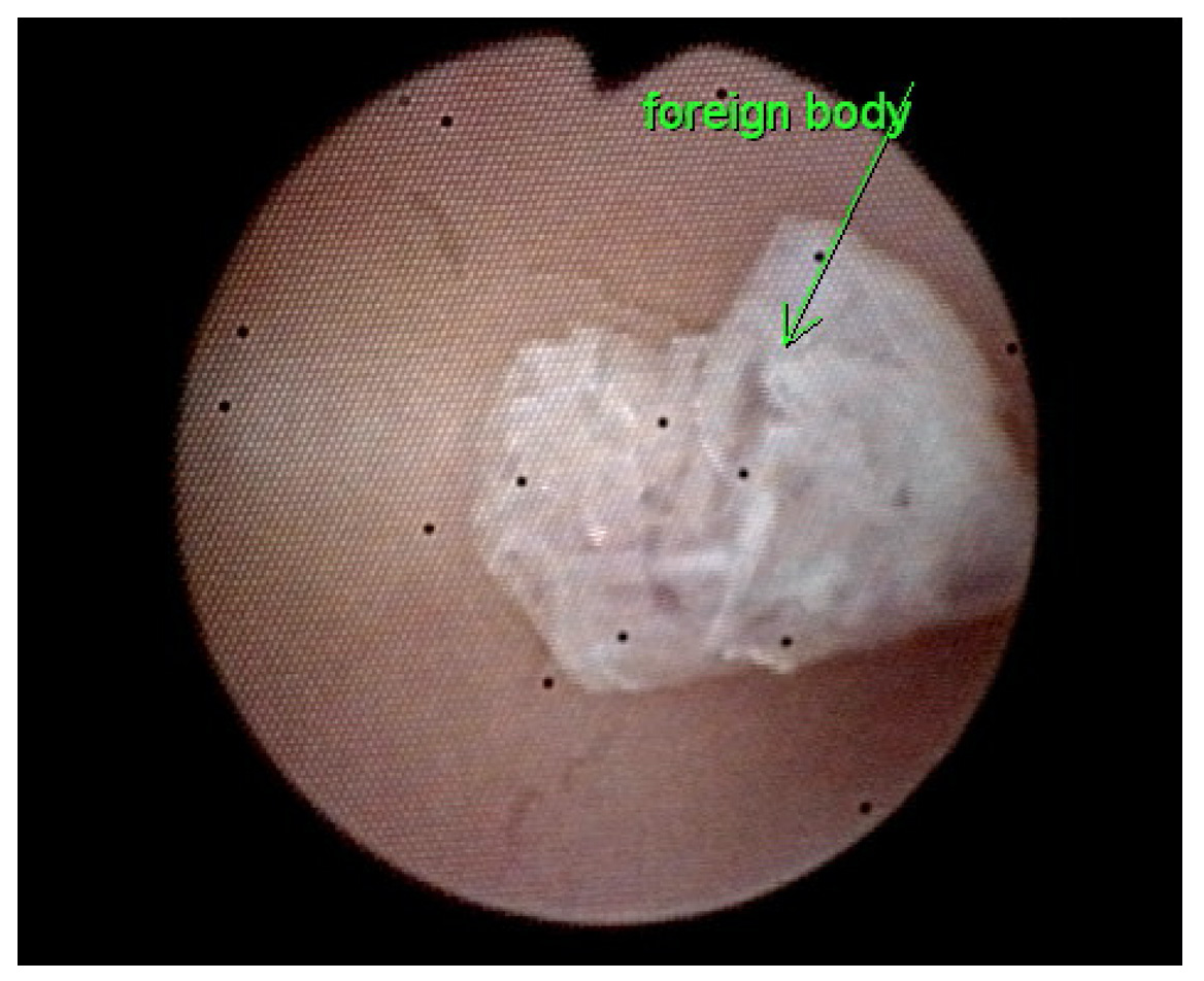 Fig. 4.Office hysteroscopy identified a piece of crumpled plastic wrap at the isthmus.