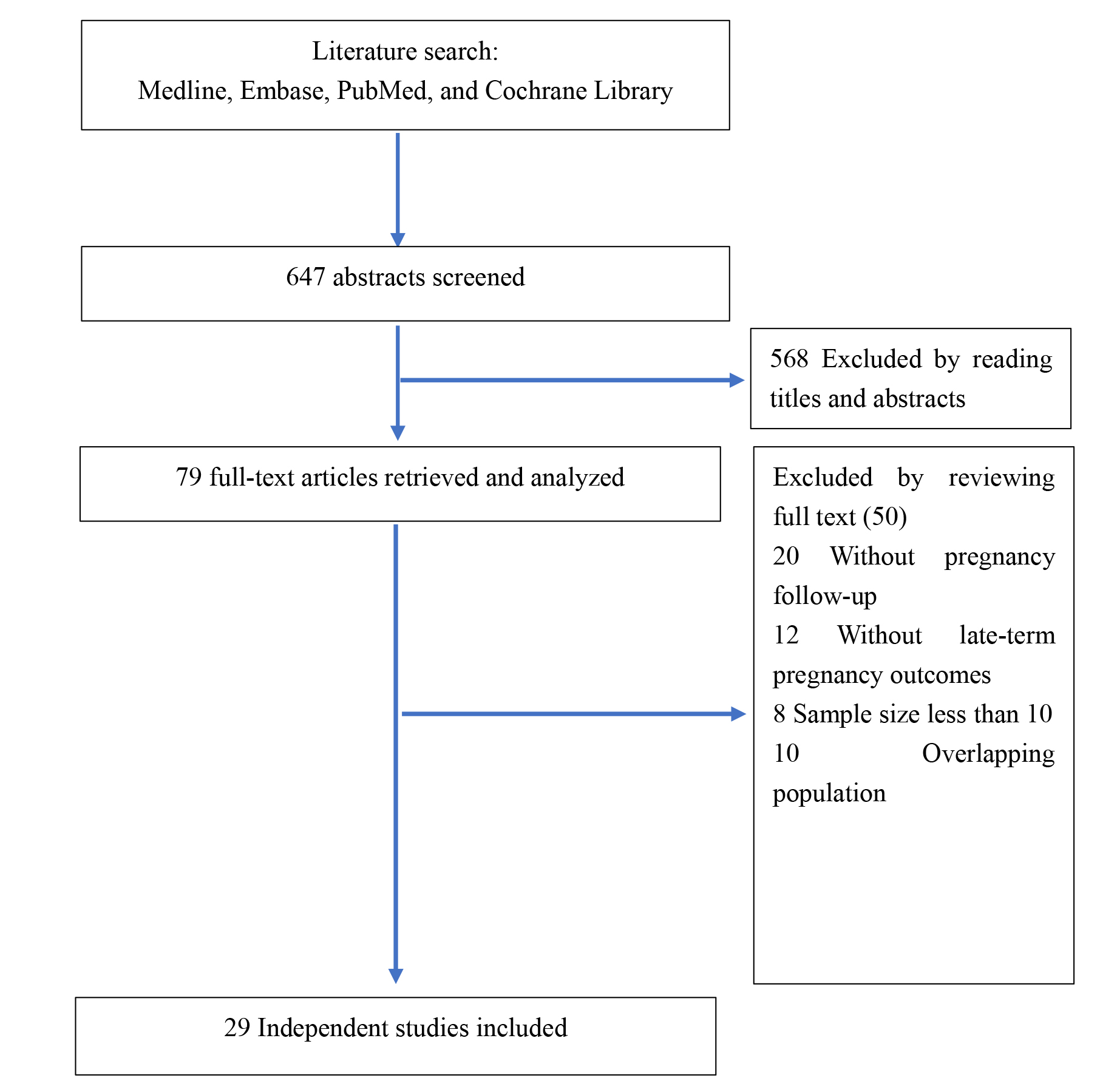 The 29 studies included in our meta-analysis reported 3 to 56 pregnancies per