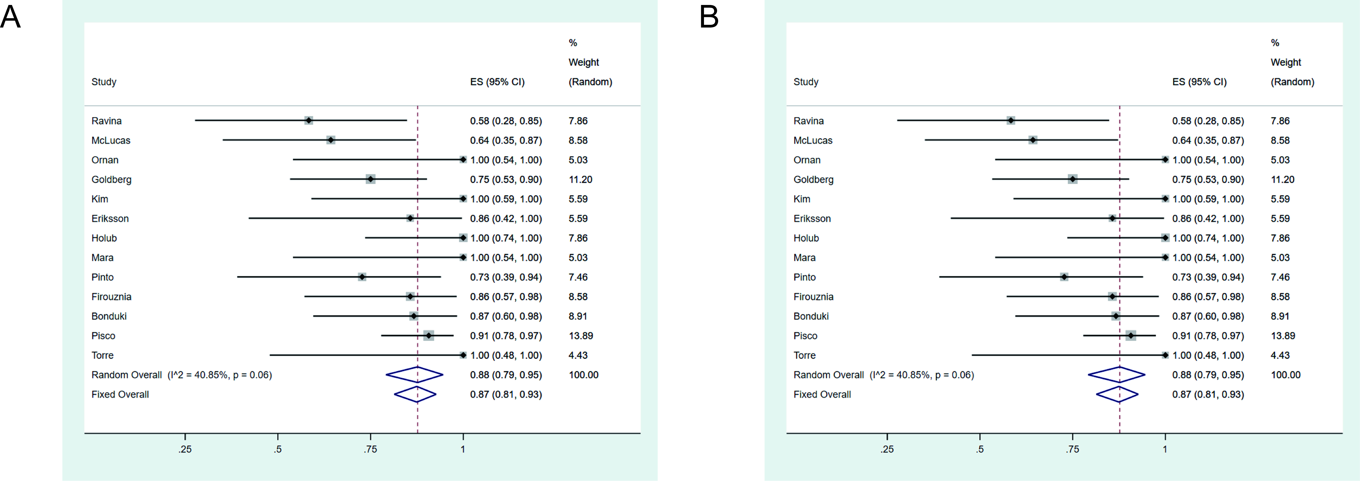 Fig. 3.Forest plots showing late-term pregnancy rate when treated by absorbable agents (A) or non-absorbable agents (B).