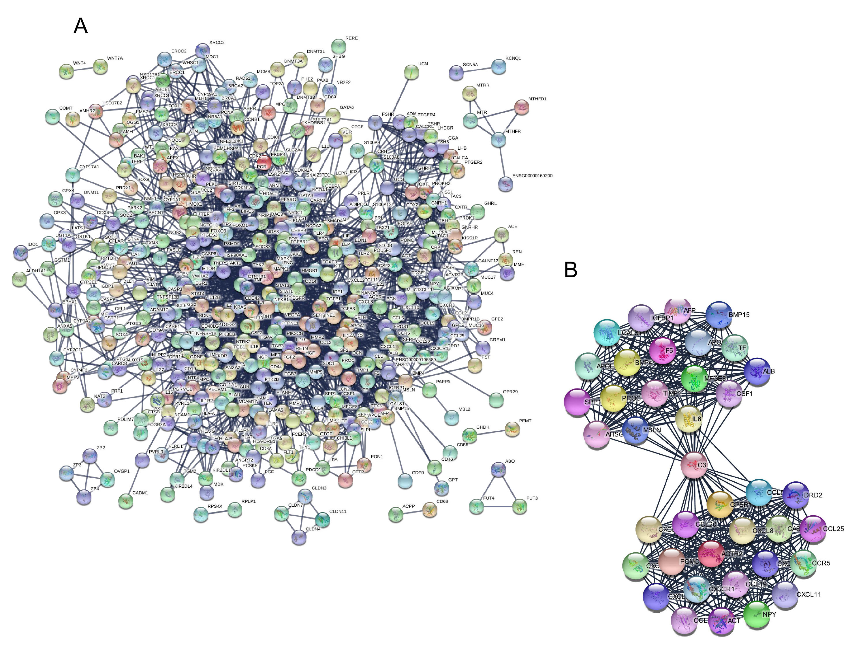 Fig. 2.Protein-protein interaction (PPI) network of differentially expressed genes. (A) Based on the STRING online database, 452 DEGs were filtered into the DEGs PPI network. (B) The most significant module from the PPI network.