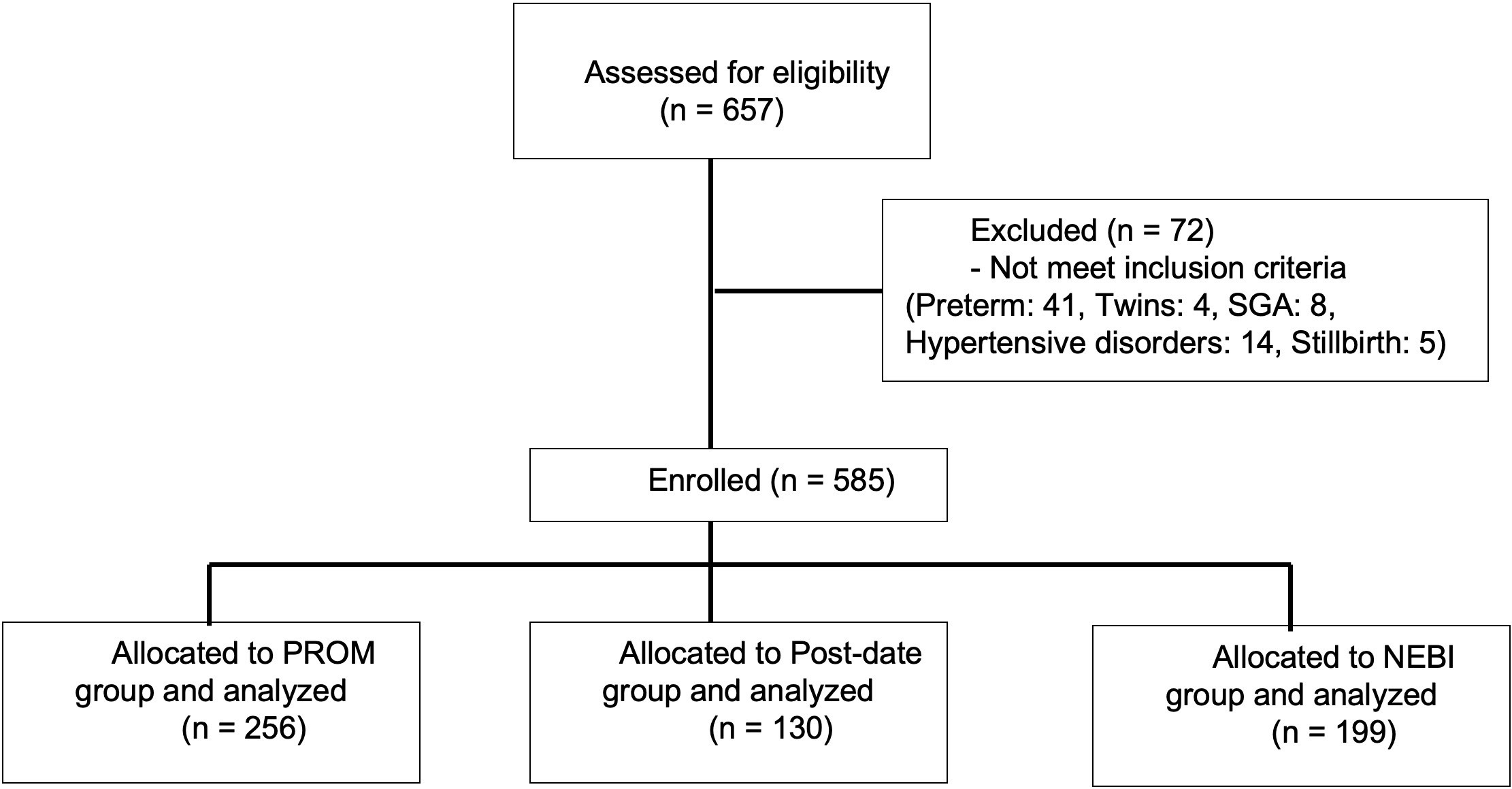 PROM, postdate, or NEBI. Categorical variables were presented as n (%) and